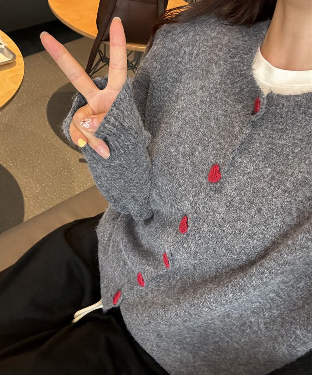 丸首ニット羽織人気 レッドハートボタン 前開きニット 無地