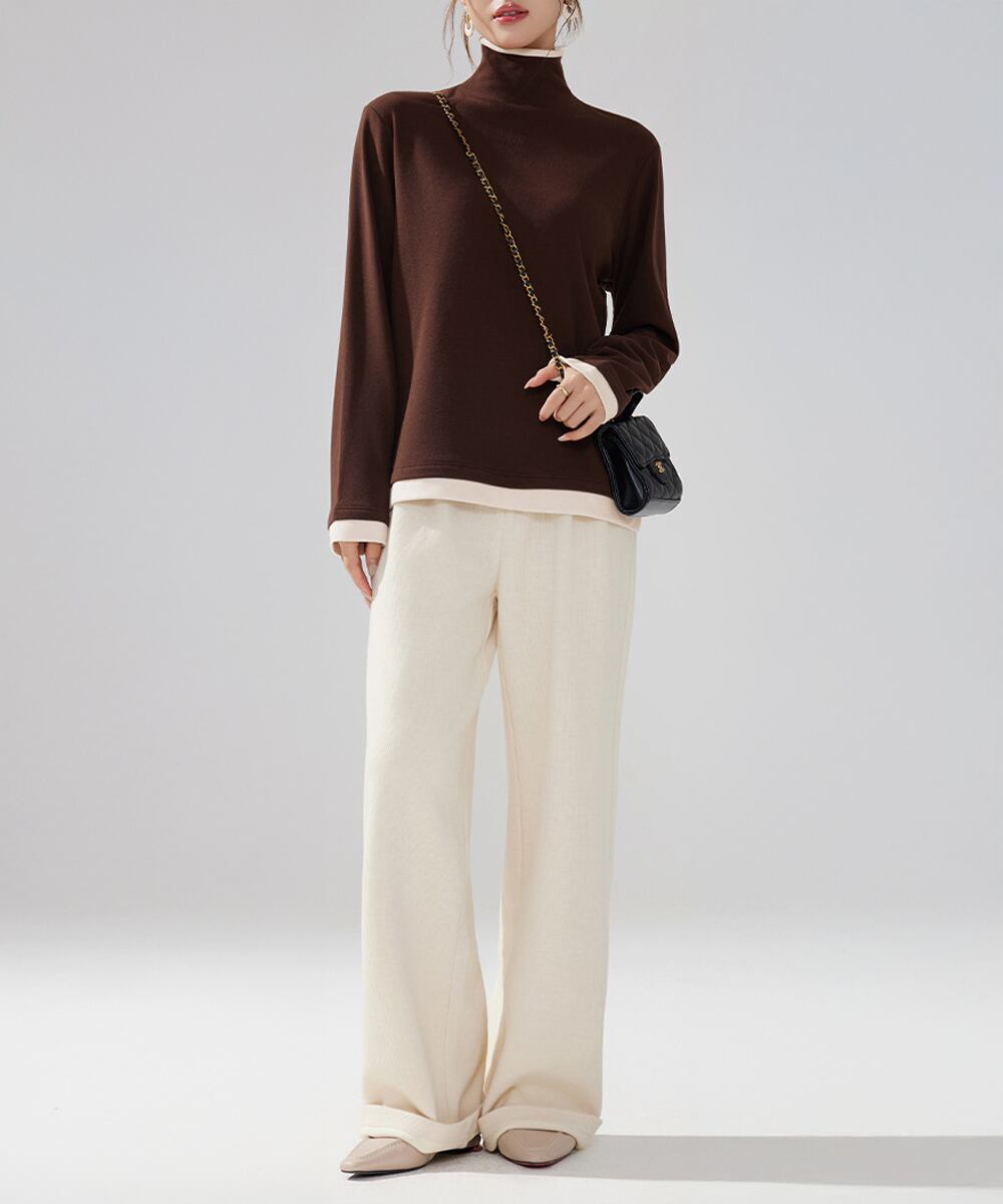 レディース 重ね着風Tシャツ タートルネックブルオーバー 大人カジュアルカットソー 秋冬 暖かい配色インナートップス防寒