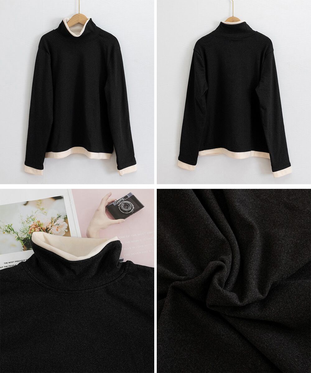 配色デザインがポイントのシンプルなハイネック長袖トップス。