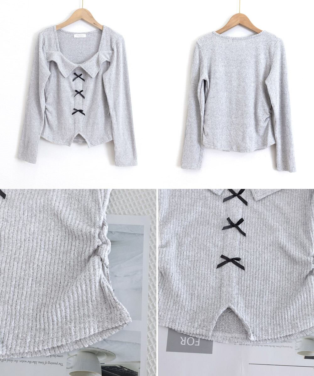 【日本倉庫即納】 リボンニットトップス スクエアネック秋服