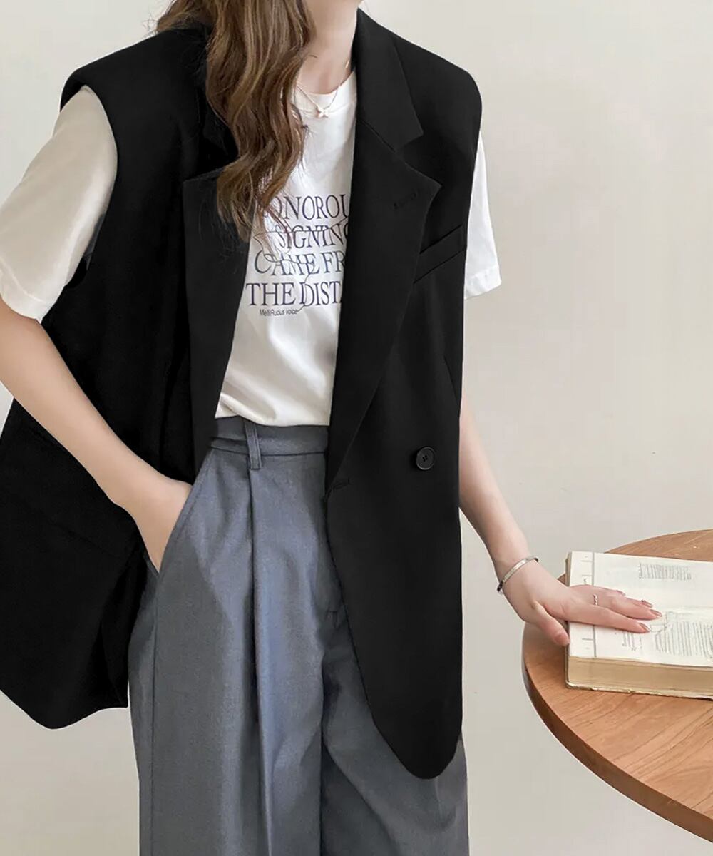 トレンド感あふれるダブルブレストが目を引くテーラードジレ。