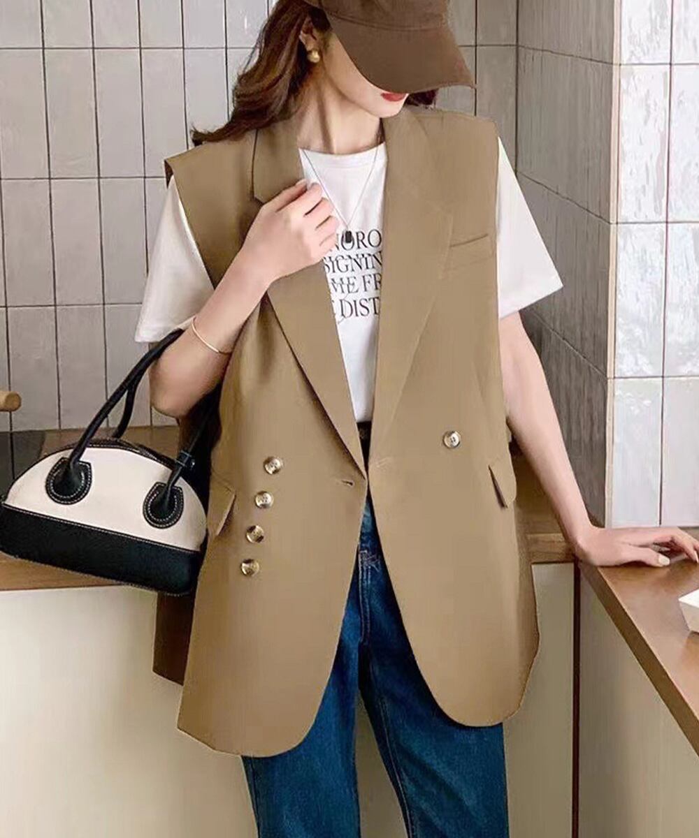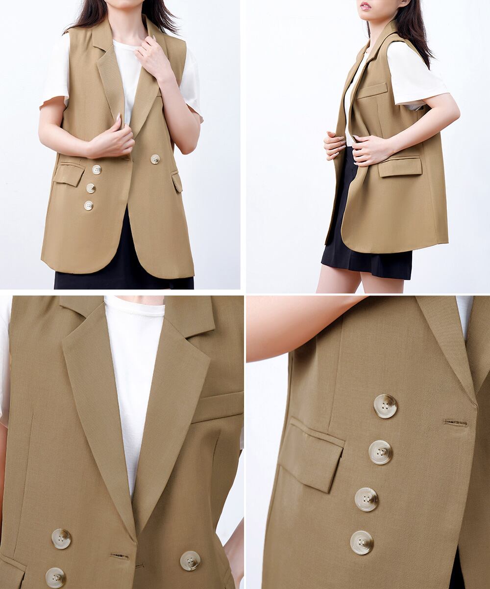 テーラードジレ ダブルボタン ノースリーブジャケット 体型カバーベスト着やせ オフィスカジュアル 春夏秋冬ライトアウター