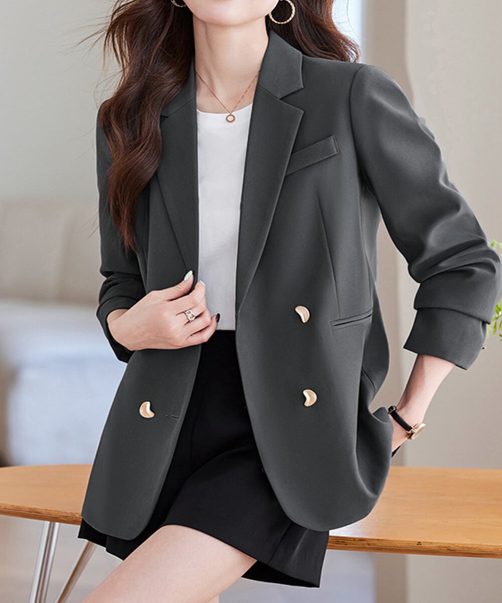 スーツジャケット ゴールドボタン オフィスカジュアル 韓国風ダブルブレザージャケット長袖 着やせ上着 ベーシックアウター