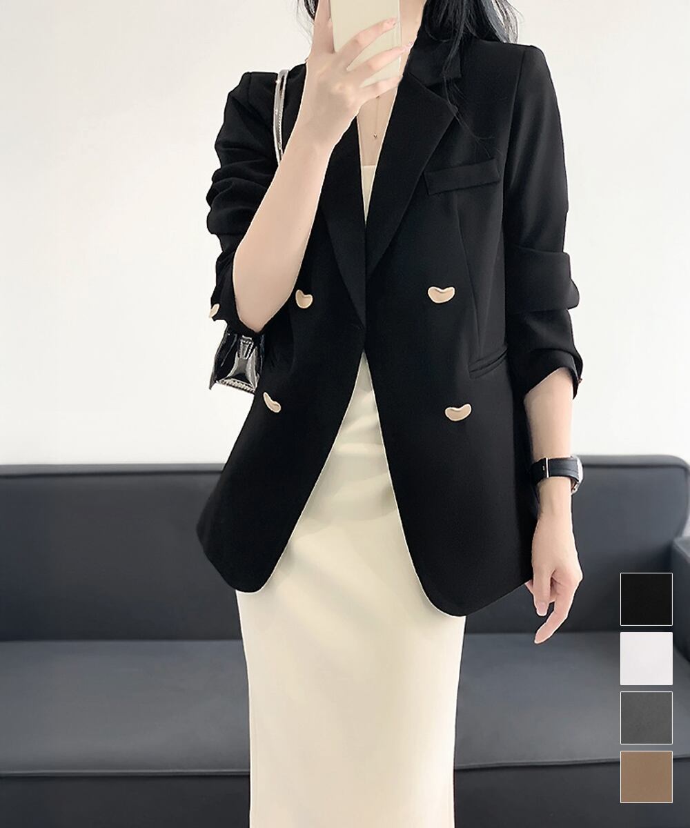 金色のボタンが上品な輝きを放つ、ダブルブレストデザインのテーラードジャケット。
