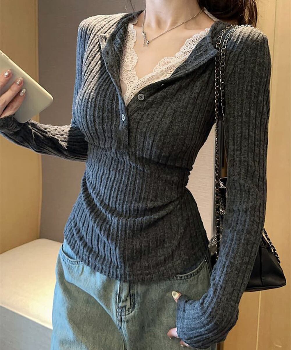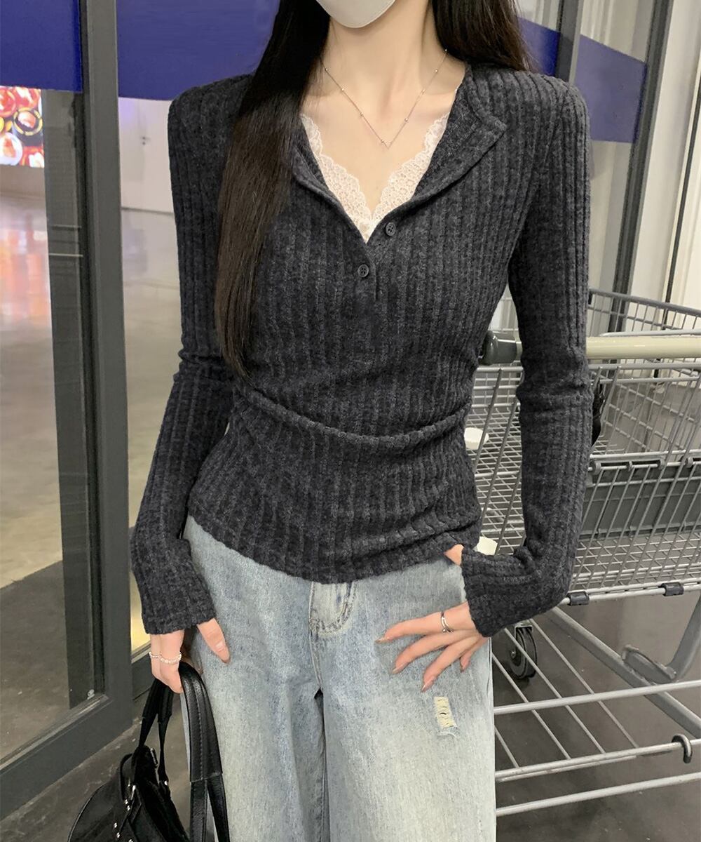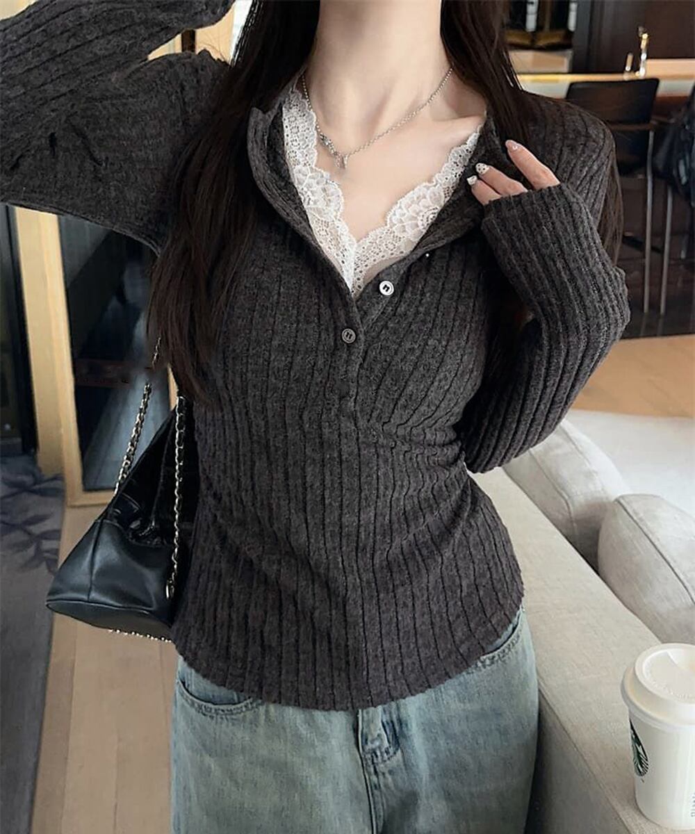 【日本倉庫即納】 レース付リブニットトップス Vネック長袖