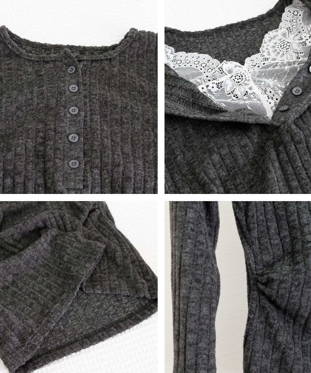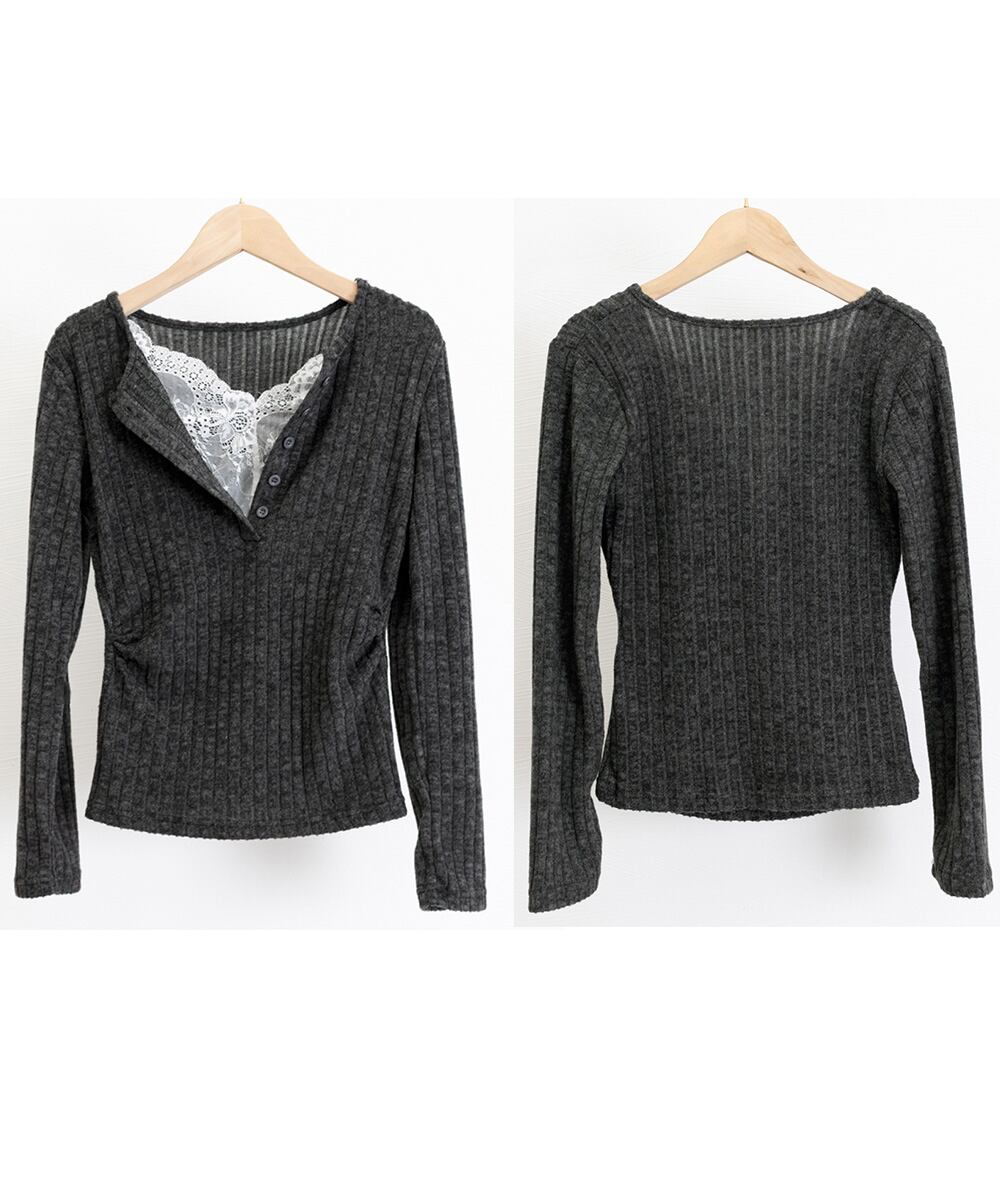 首元はVネックで、レースの切り替えがさりげないアクセントに。