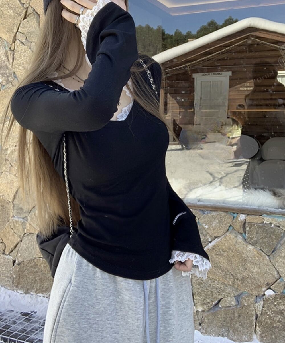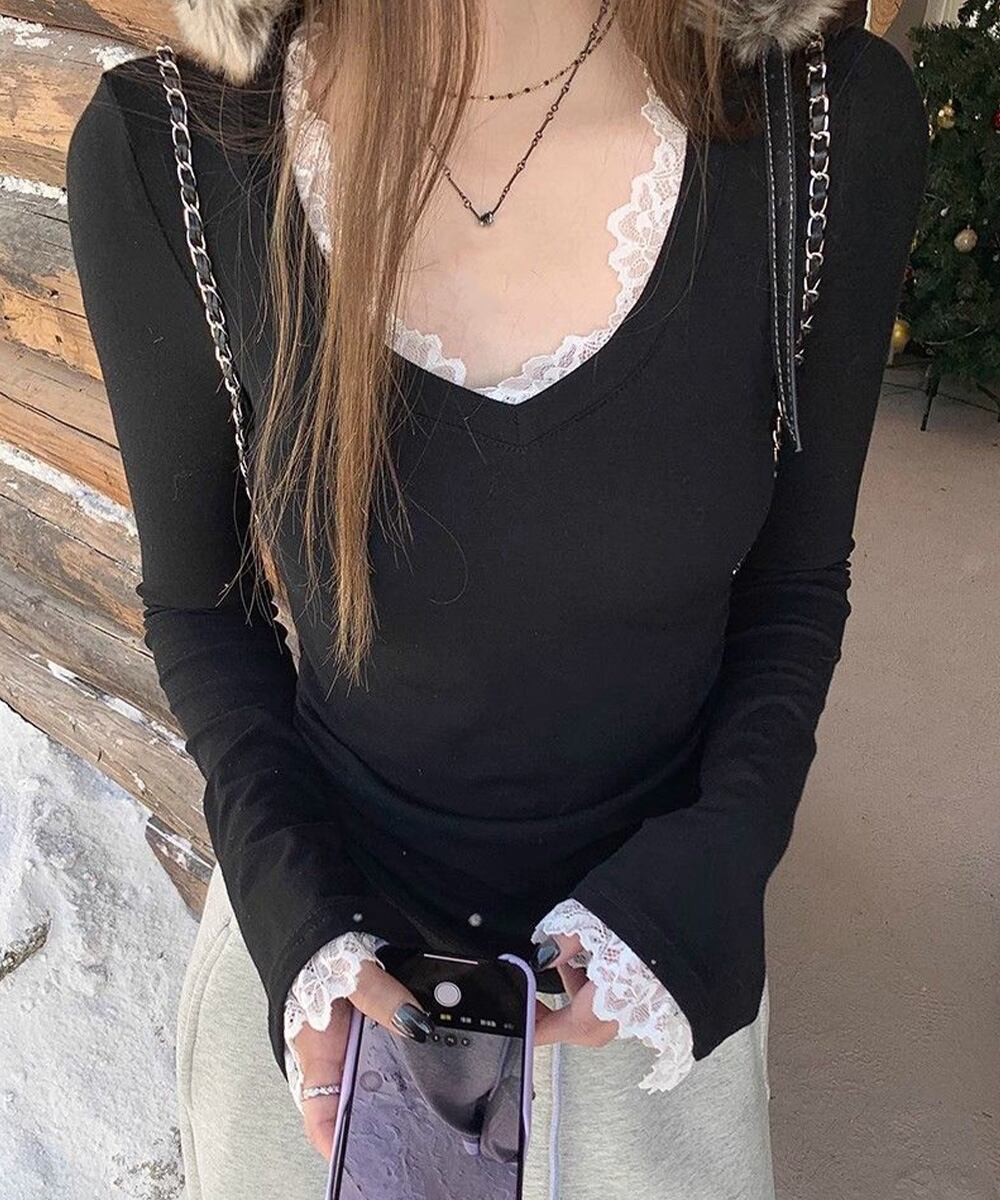 【日本倉庫即納】 レース付TシャツVネック長袖リブトップス