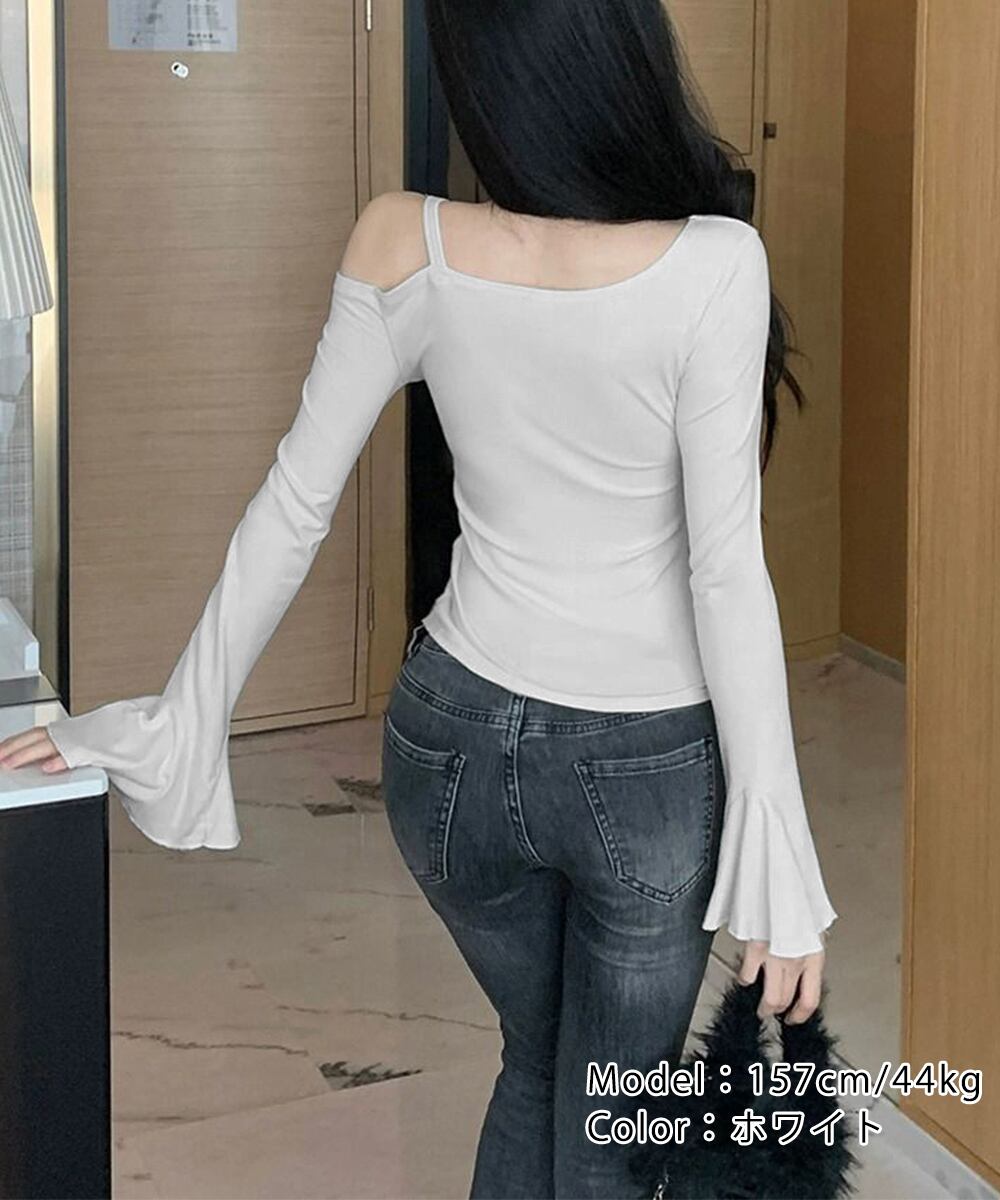 肩見せトップス無地 きれいめカットソー フレア袖Tシャツ秋