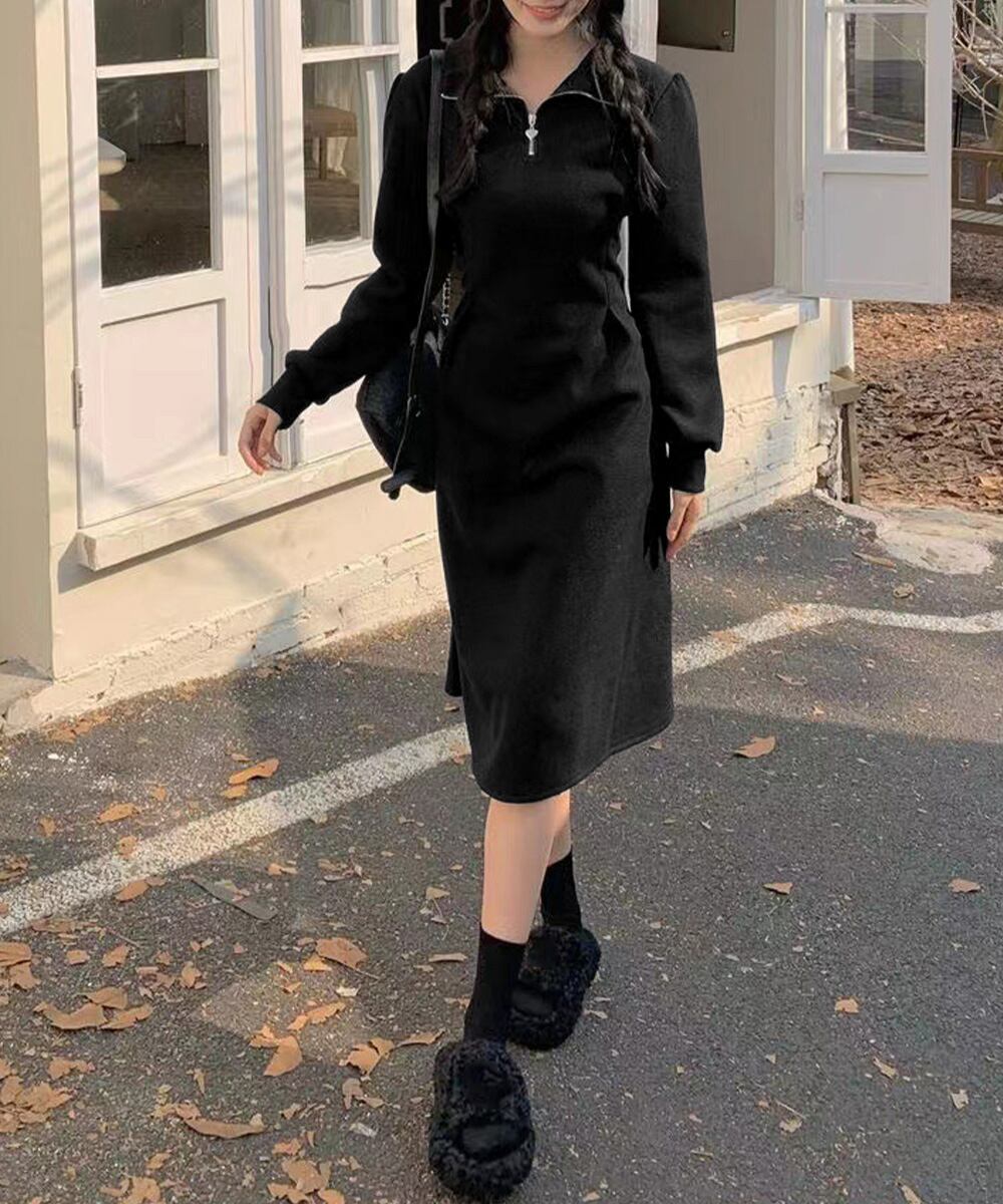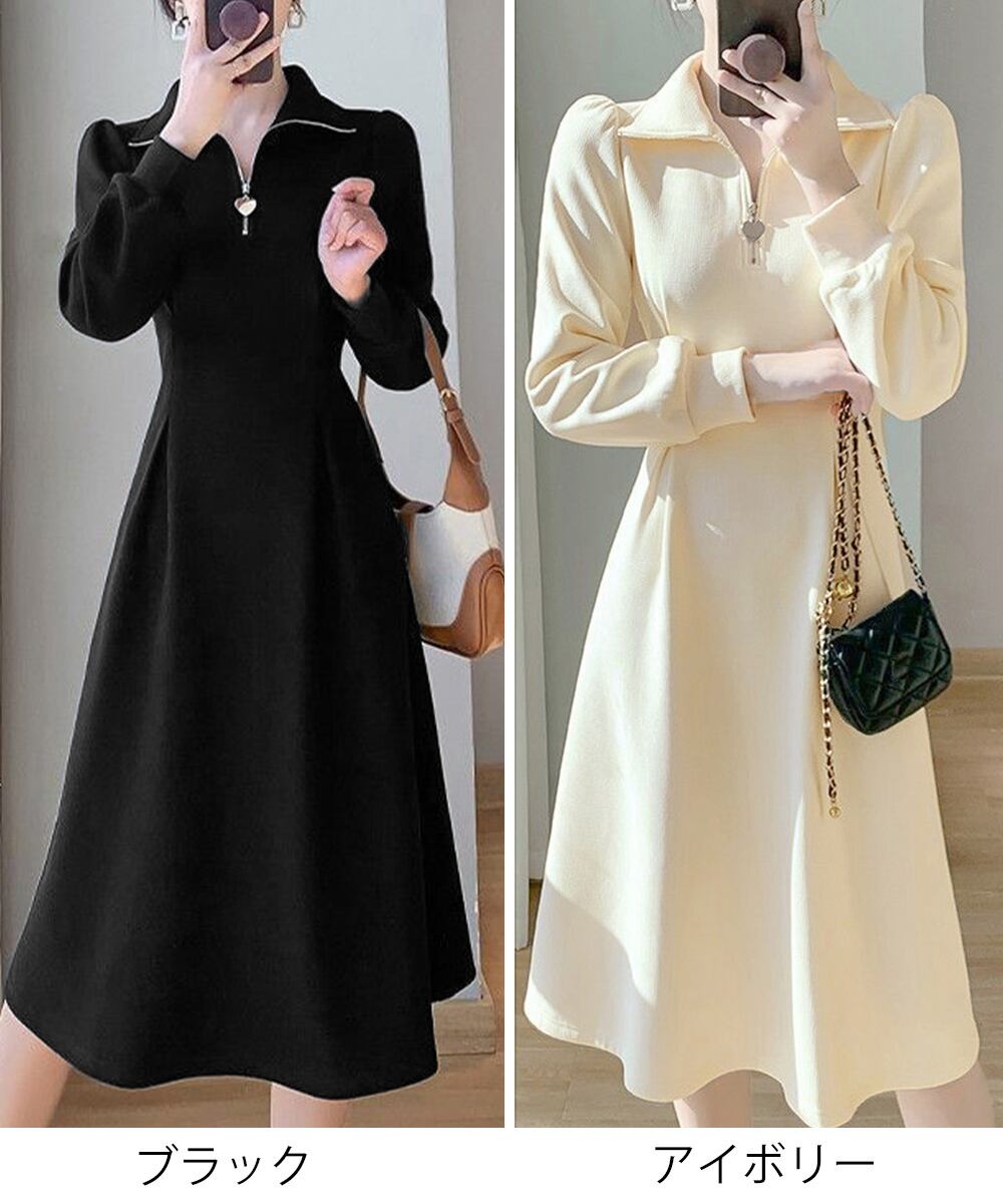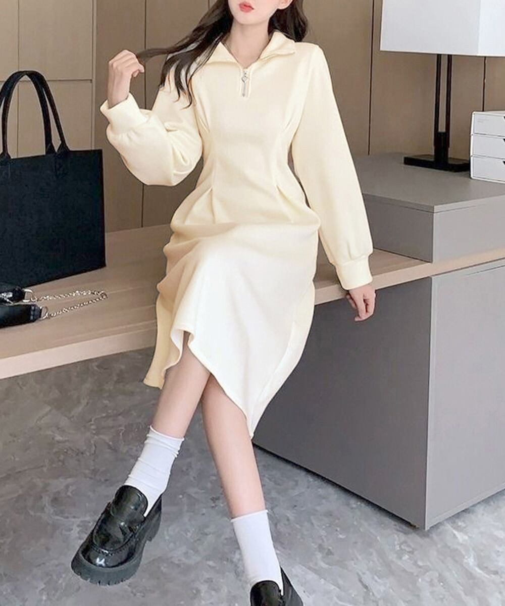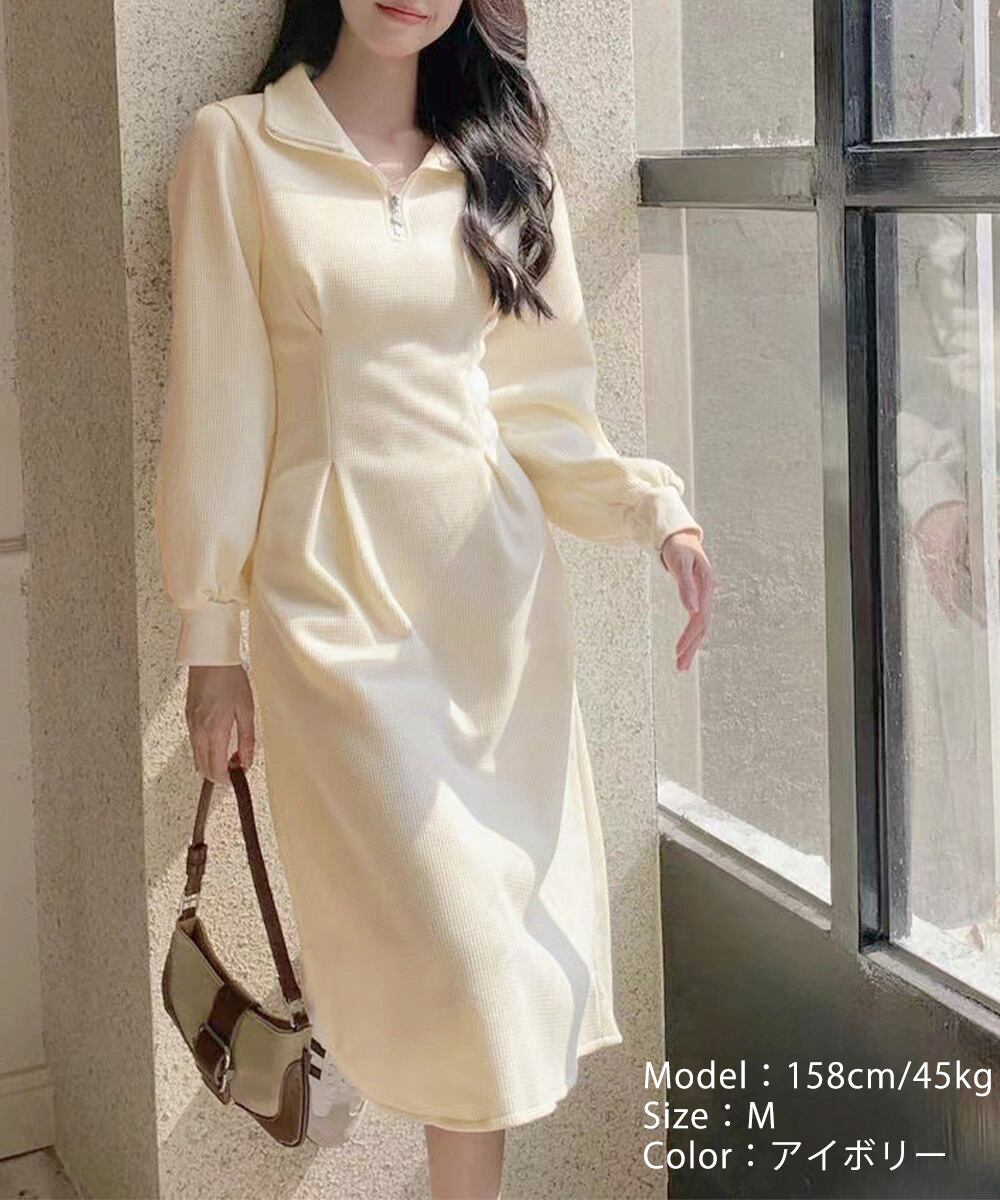 【日本倉庫即納】 ハーフジップワンピース長袖ウエストタック