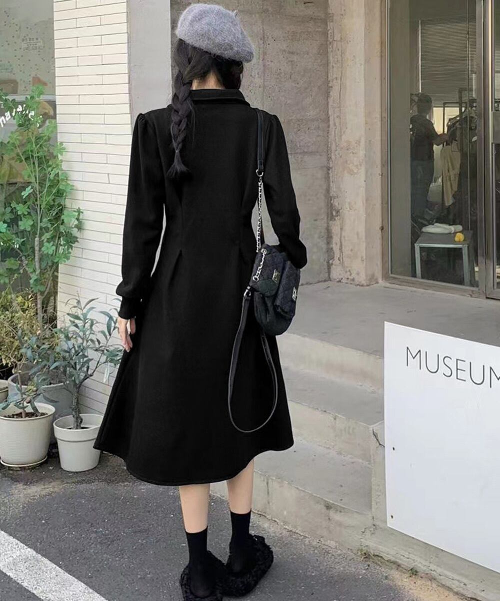 レディース 襟付きワンピース 体型カバー Aラインワンピ きれいめカジュアル 無地オシャレ 大人上品フレアワンピース春秋