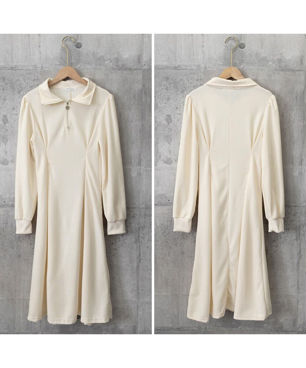 ハーフジップがアクセントになった、フレアシルエットのミディ丈ワンピース。
