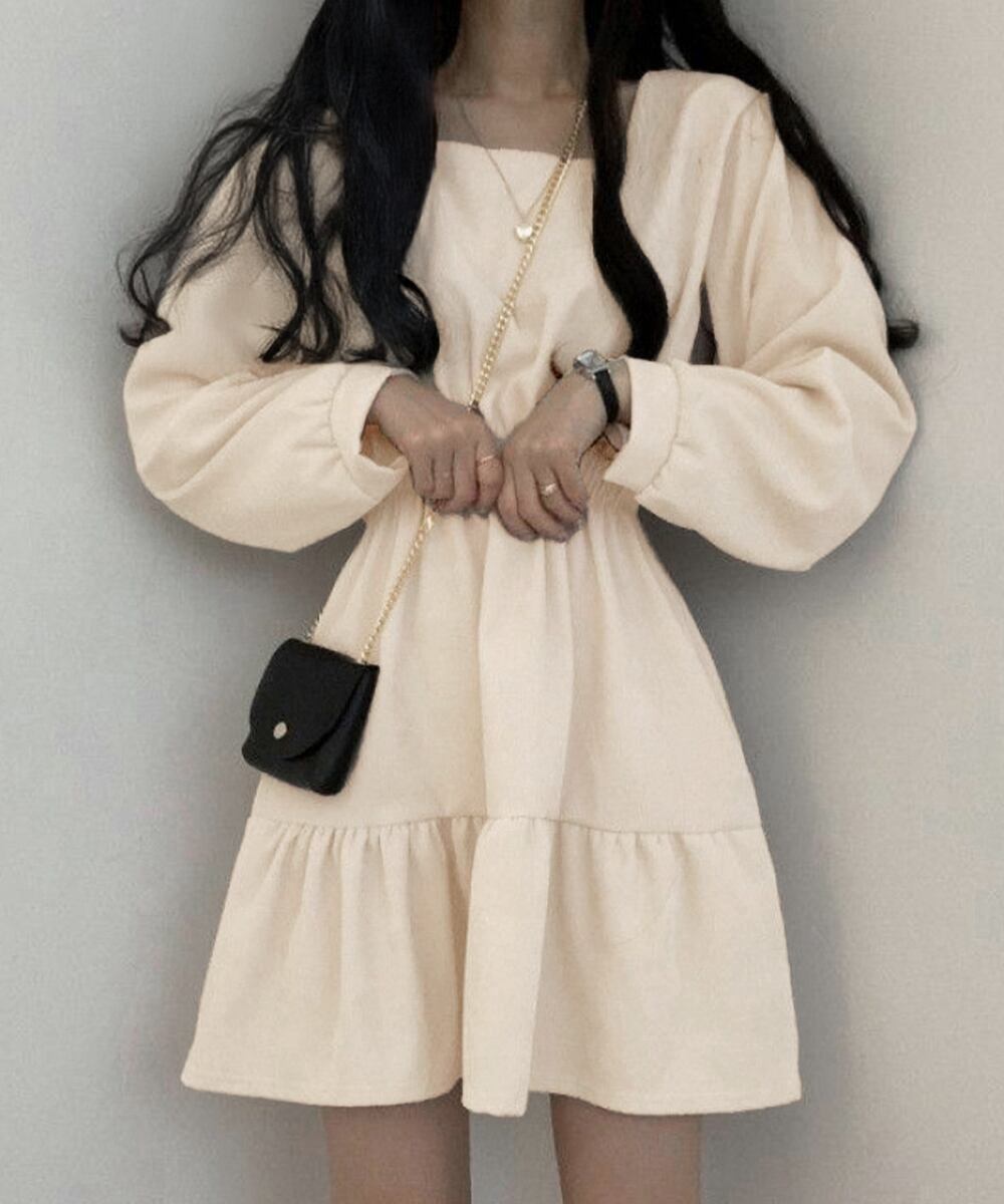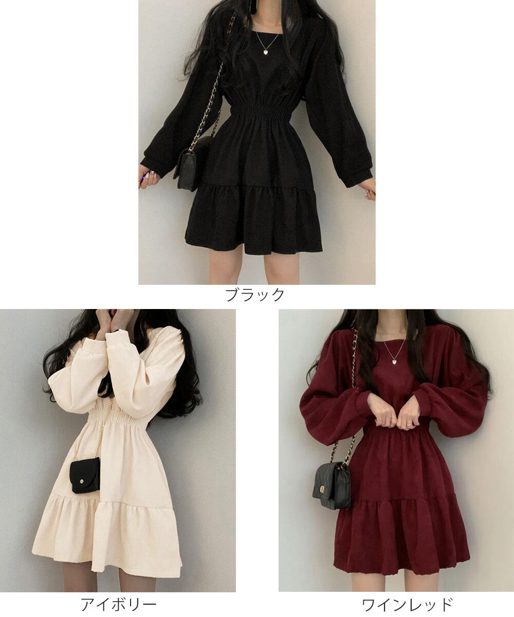 スクエアネック長袖 韓国風ワンピース黒 ガーリーワンピース