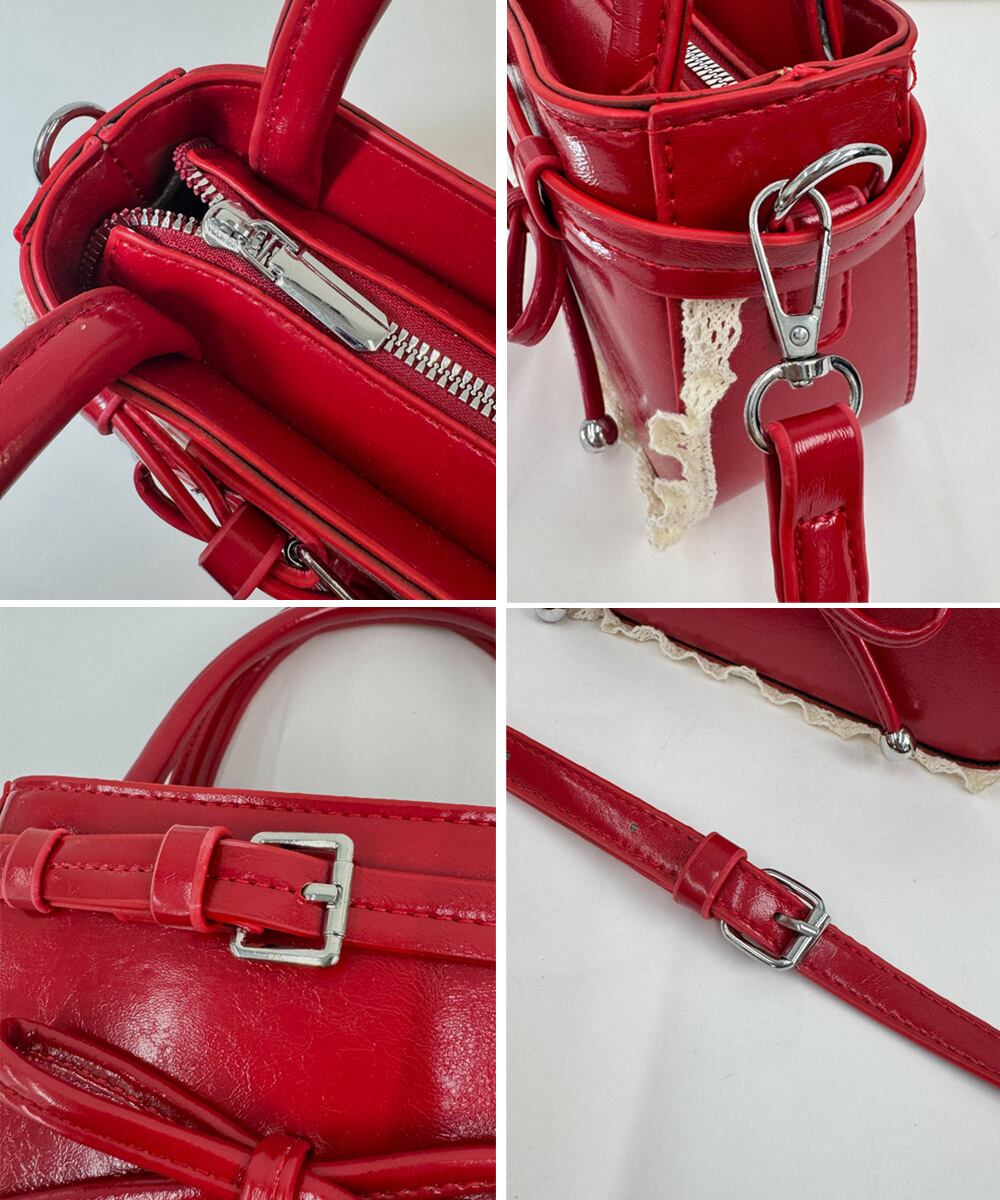 フロントのリボンと縁にあしらわれたレースが目を惹く、フェイクレザー素材の2WAYミニバッグ。