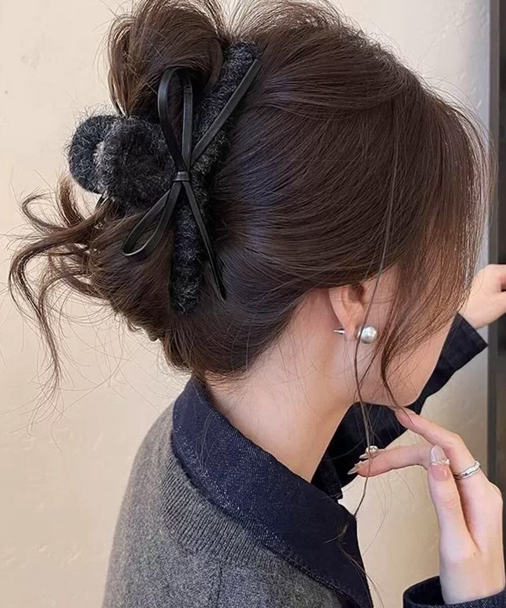大きめのクリップで存在感がありながらも、落ち着いたカラーリングと素材で、大人可愛い雰囲気を演出。