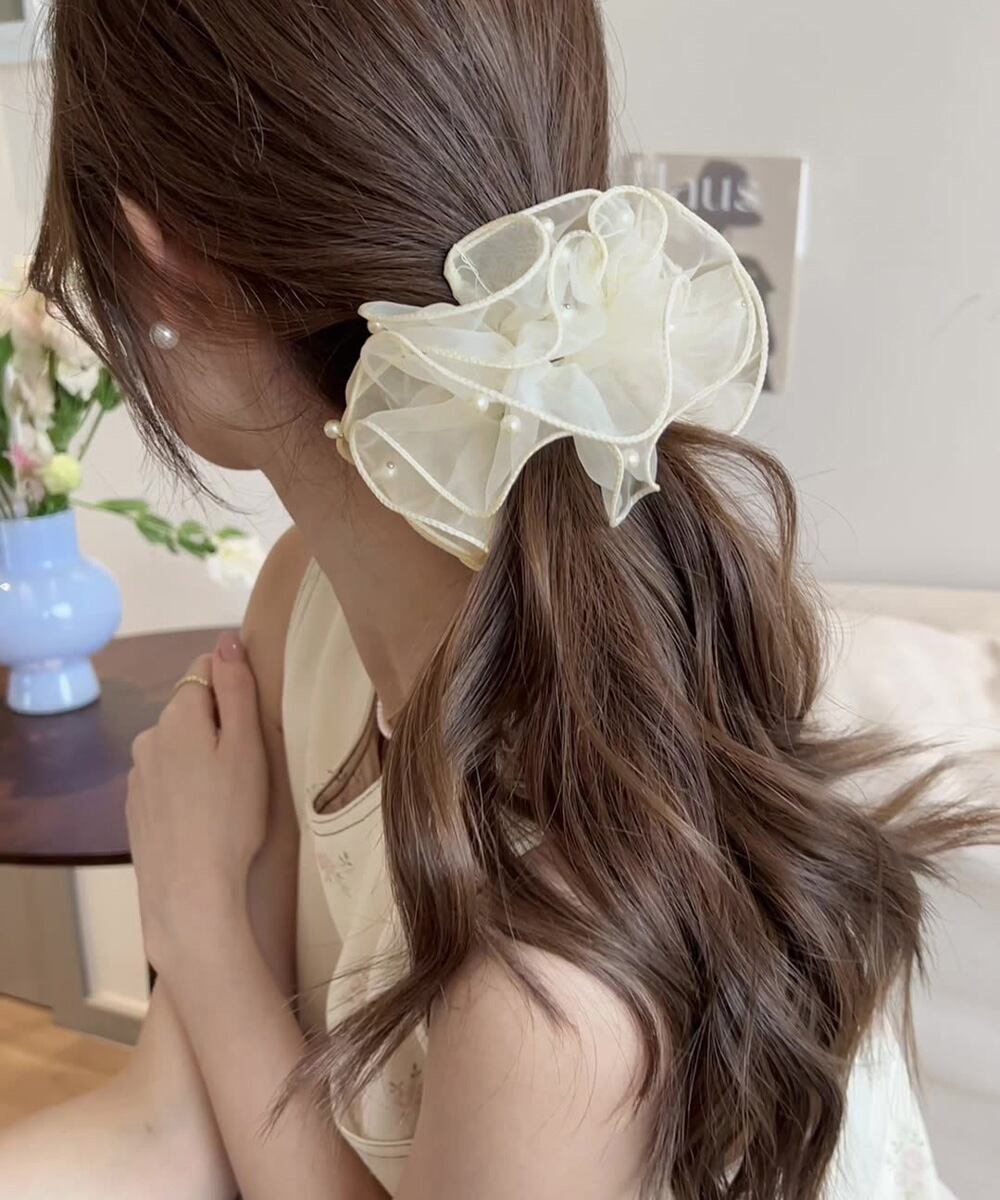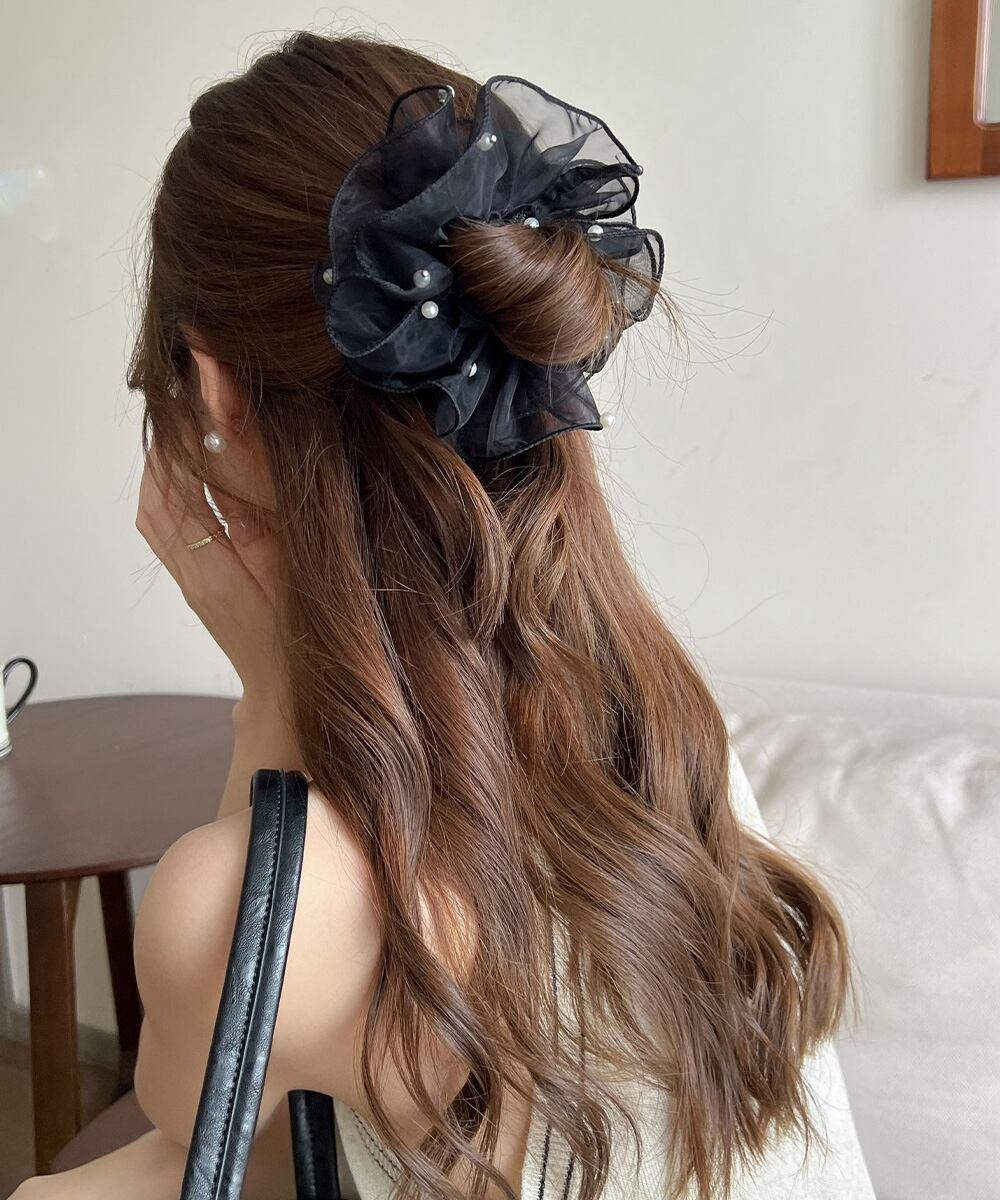 小粒パールを散りばめた、ふんわり透け感のあるオーガンジー素材の上品なシュシュ。