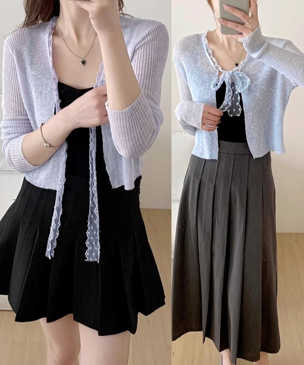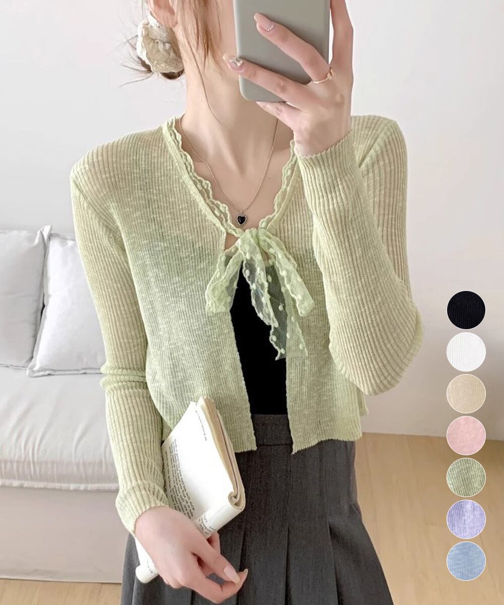 スカラップレースのリボンが可愛らしい印象を与えてくれるボウタイカーディガン。