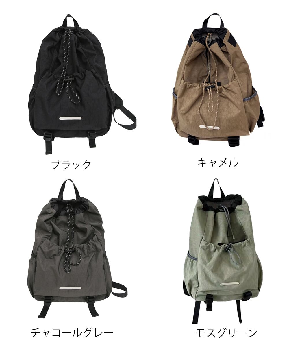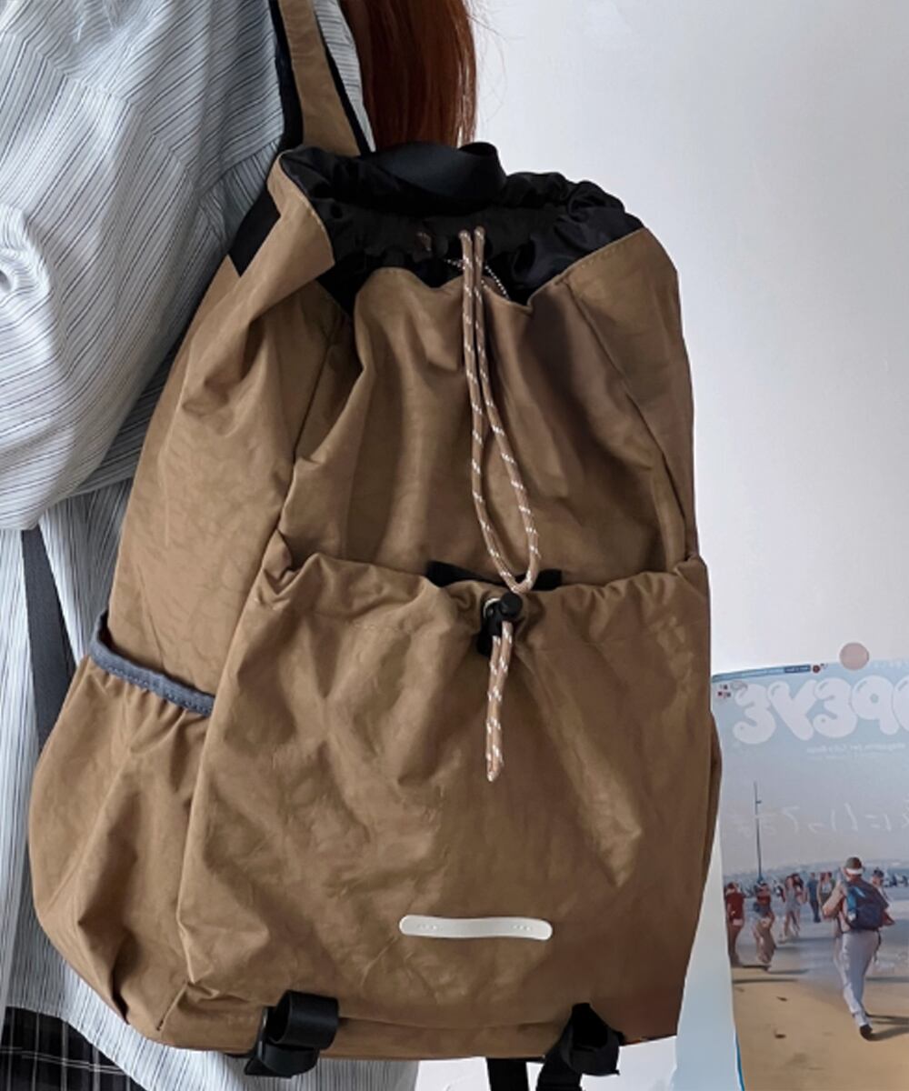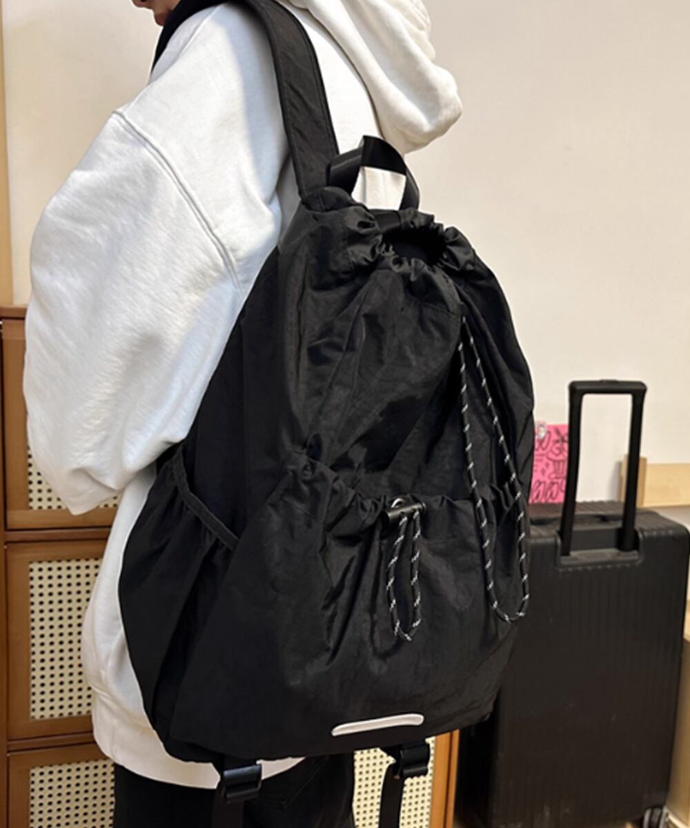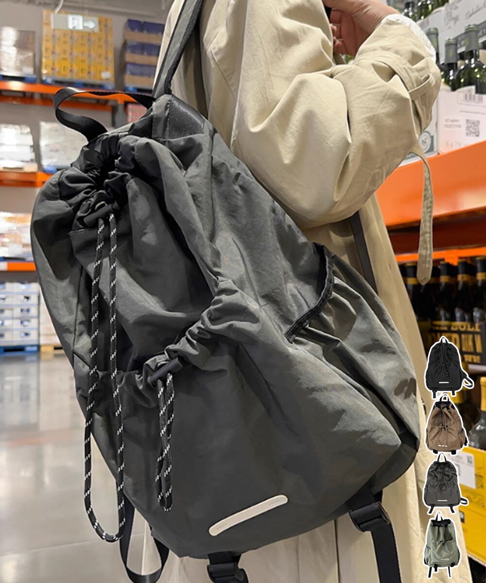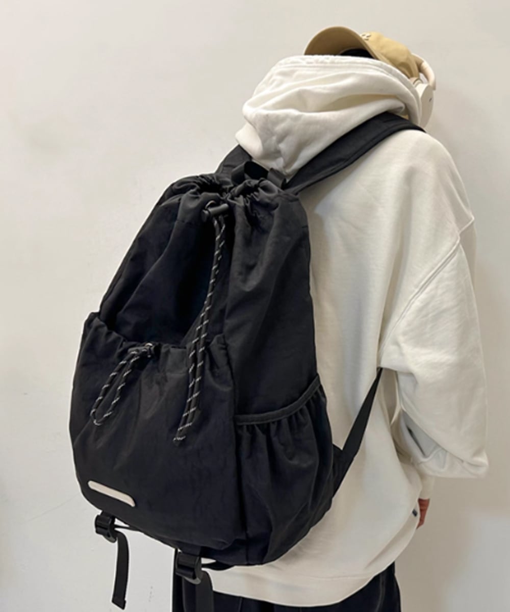スタイリッシュなドローストリングデザインが目を引く、大容量リュックサック。