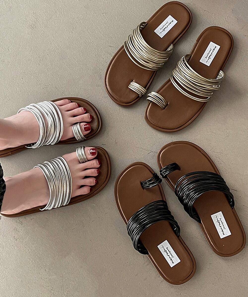モードな雰囲気漂うメタリックストラップのトングサンダル。