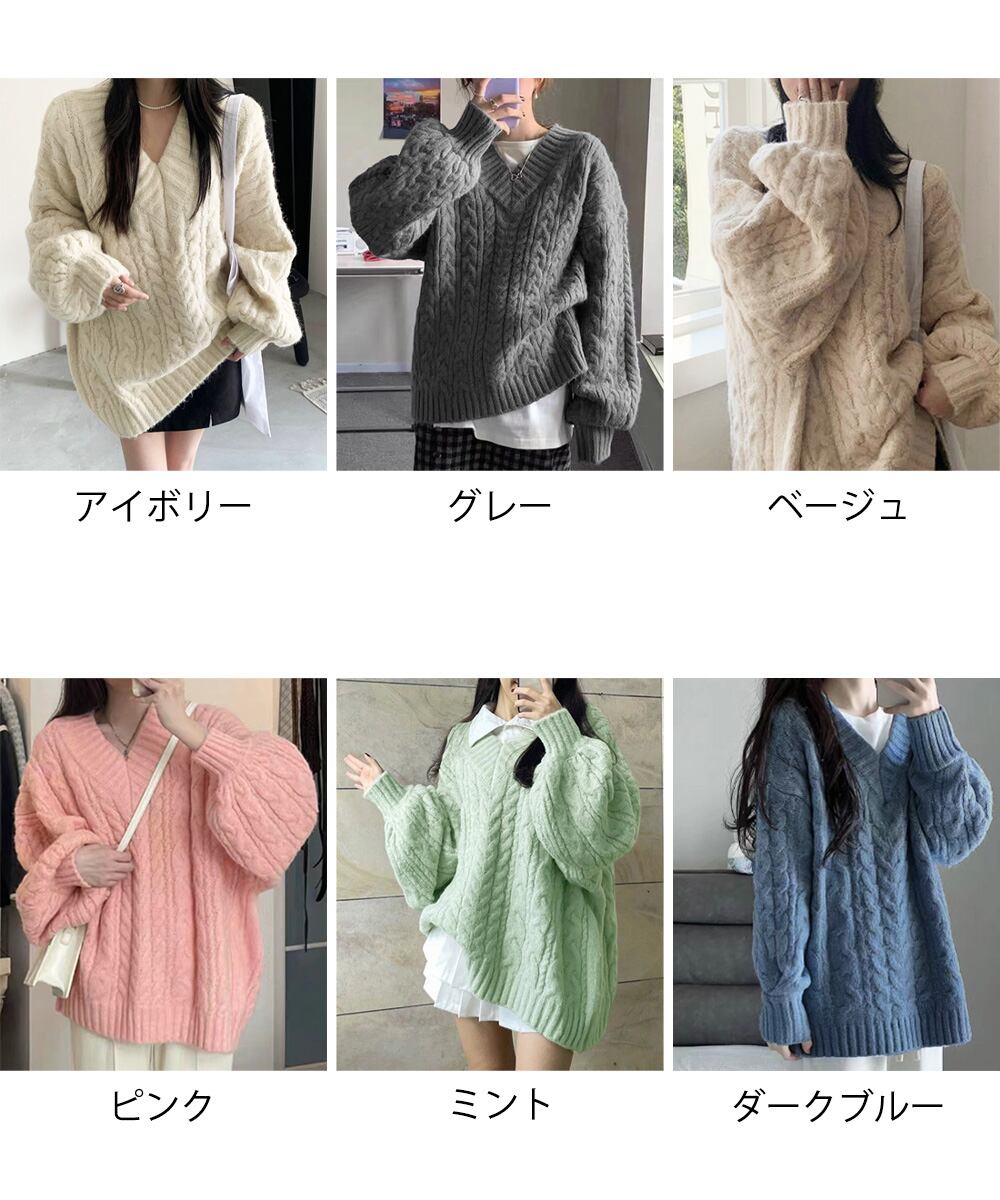寒い季節にぴったりな、暖かみのあるVネックのケーブル編みニットトップス。