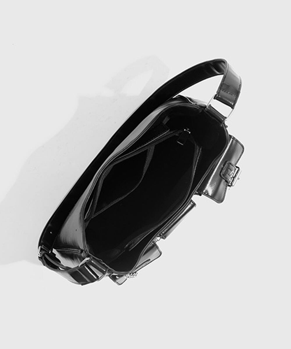 光沢のあるブラックPUレザーを使用した、モード感漂うデザインが魅力。