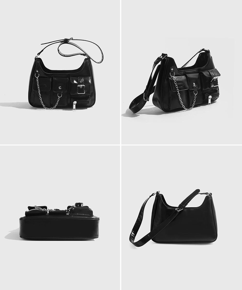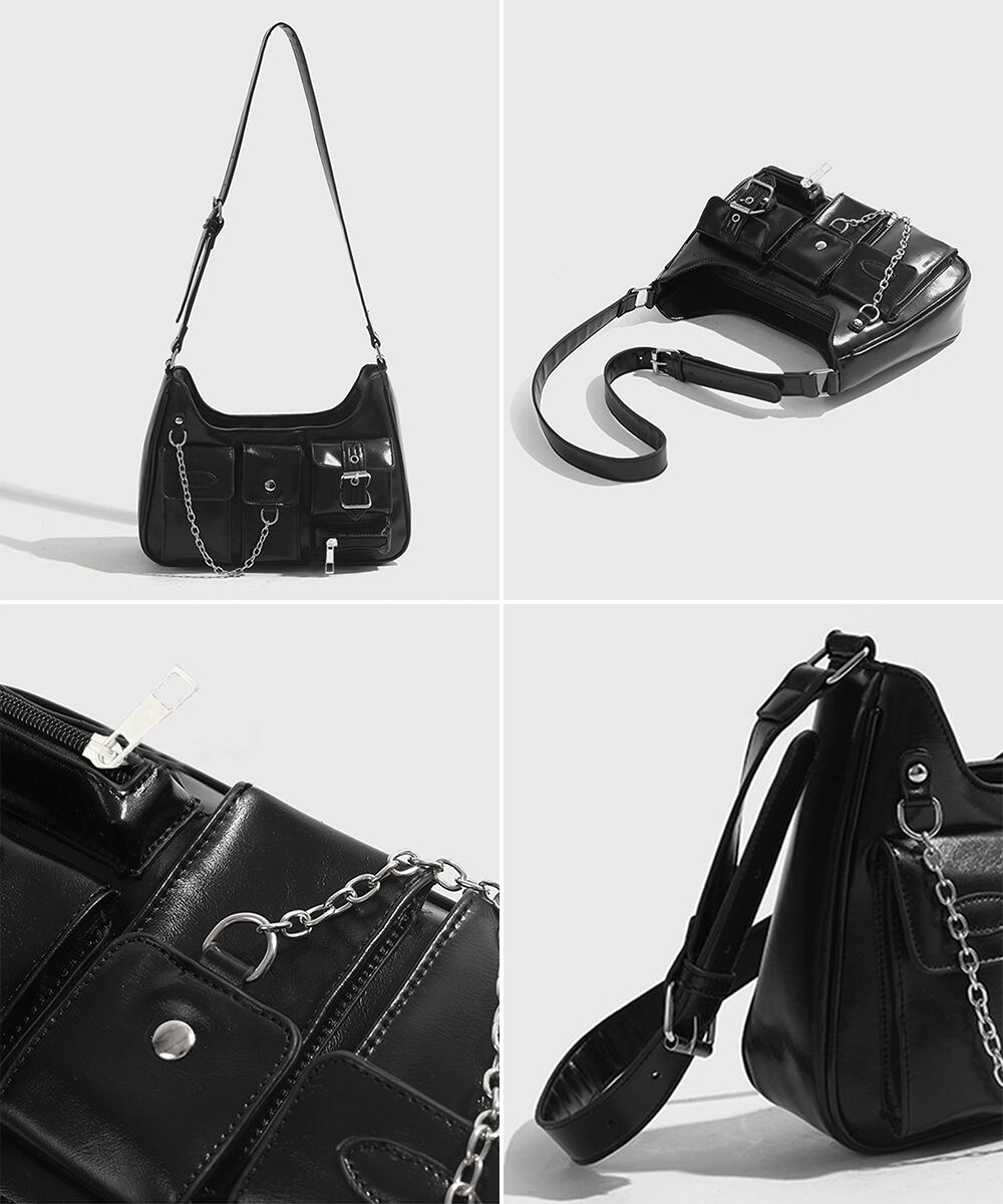 複数のポケットとチェーンがアクセントとなり、実用性とスタイリッシュさを兼ね備えた。