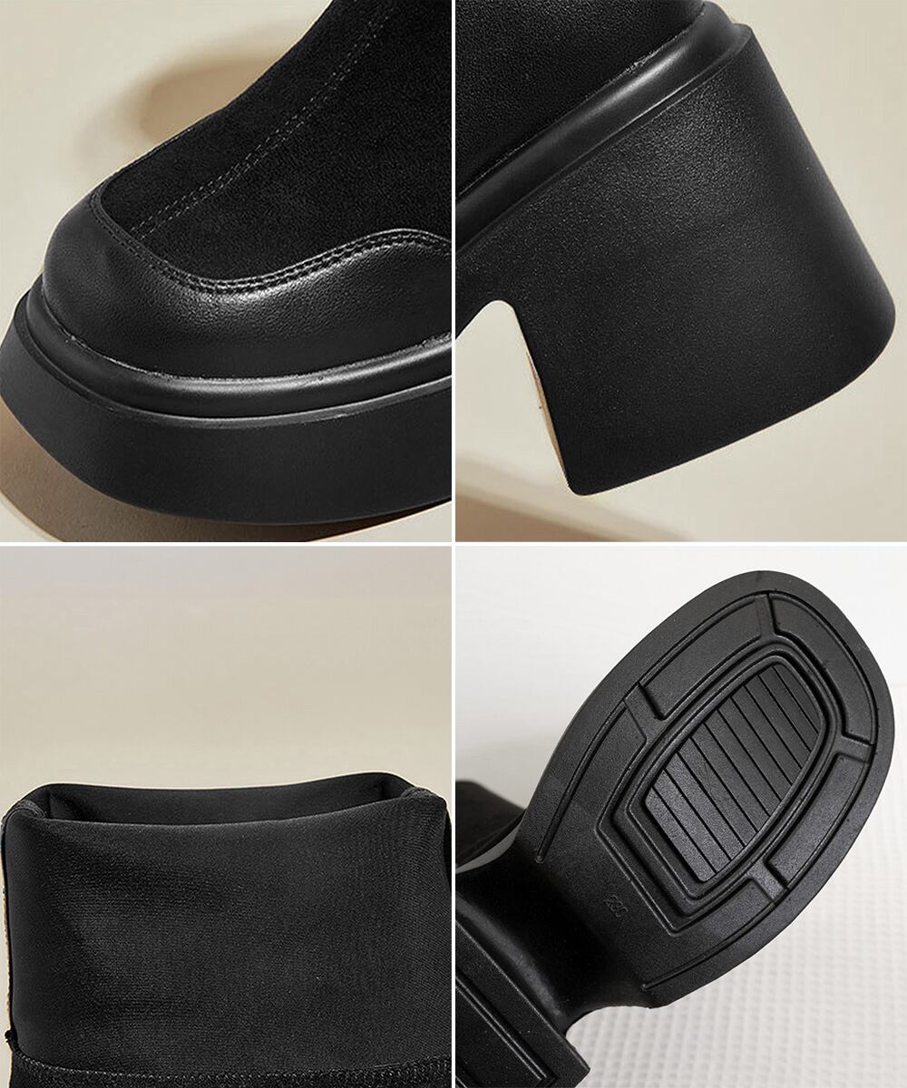 異素材をミックスした、個性あふれるデザインのスタイリッシュなニーハイブーツ。