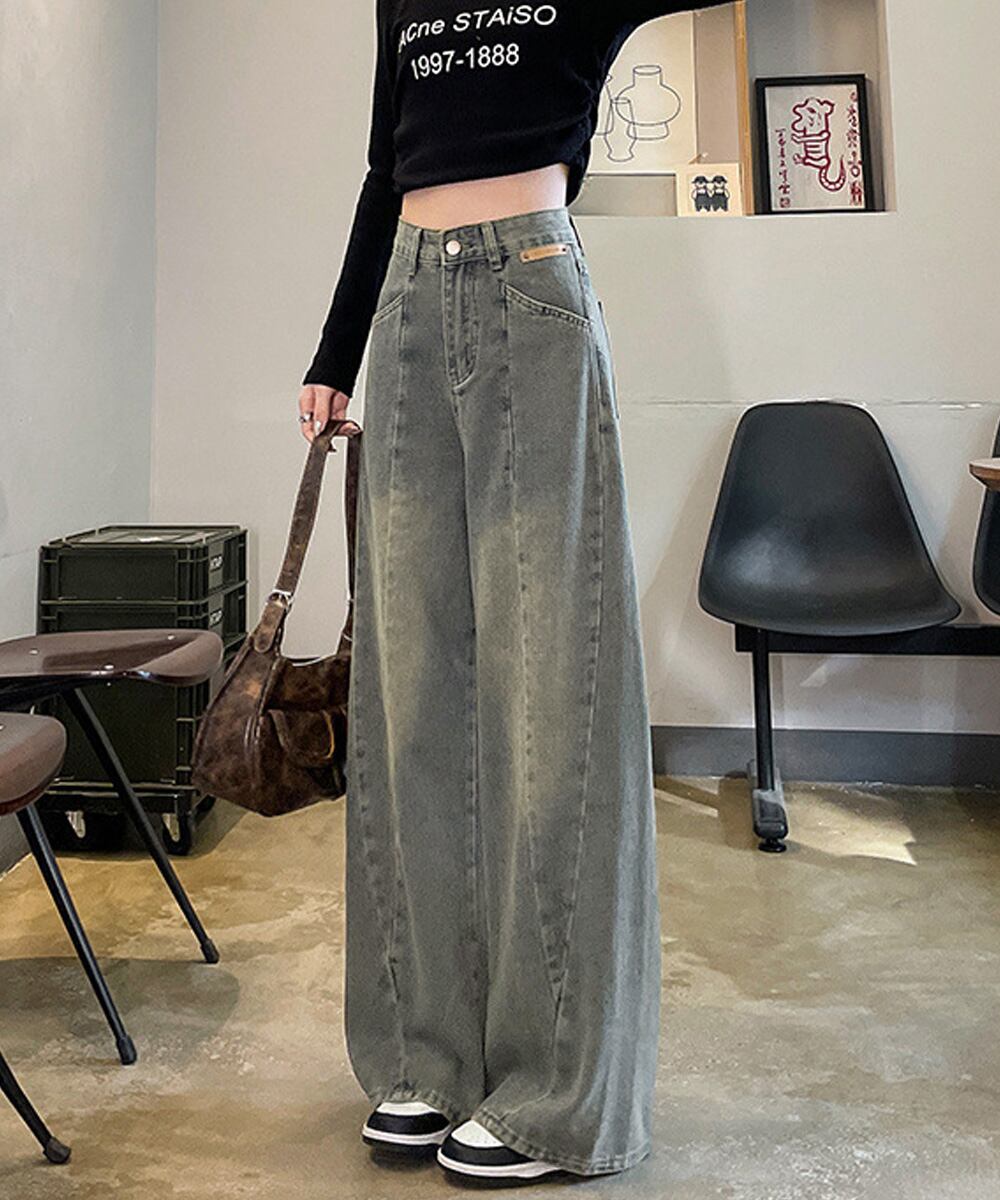 レディース ウォッシュ加工 ルーズデニム 色落ちジーンズ アメカジ 古着ファッション カジュアル ワイドパンツ 長ズボン