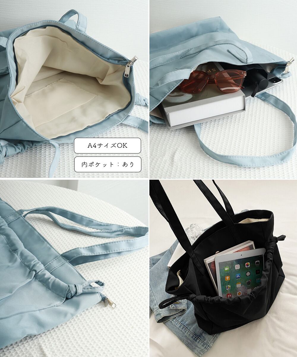軽くて使いやすいギャザーデザインのトートバッグ。