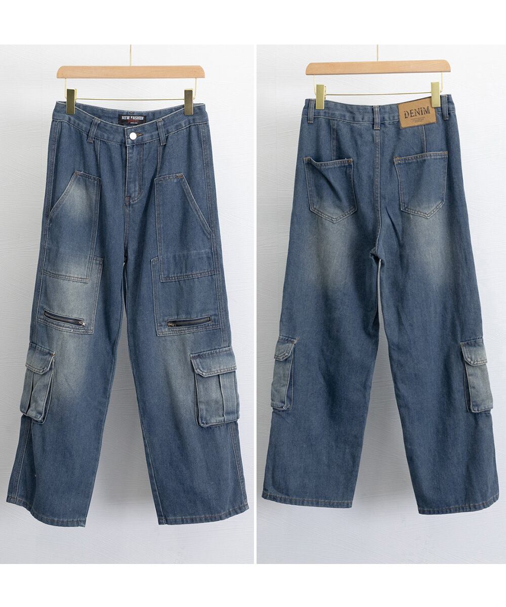 【日本倉庫即納】 デニムカーゴパンツ 韓国風ワイドジーンズ