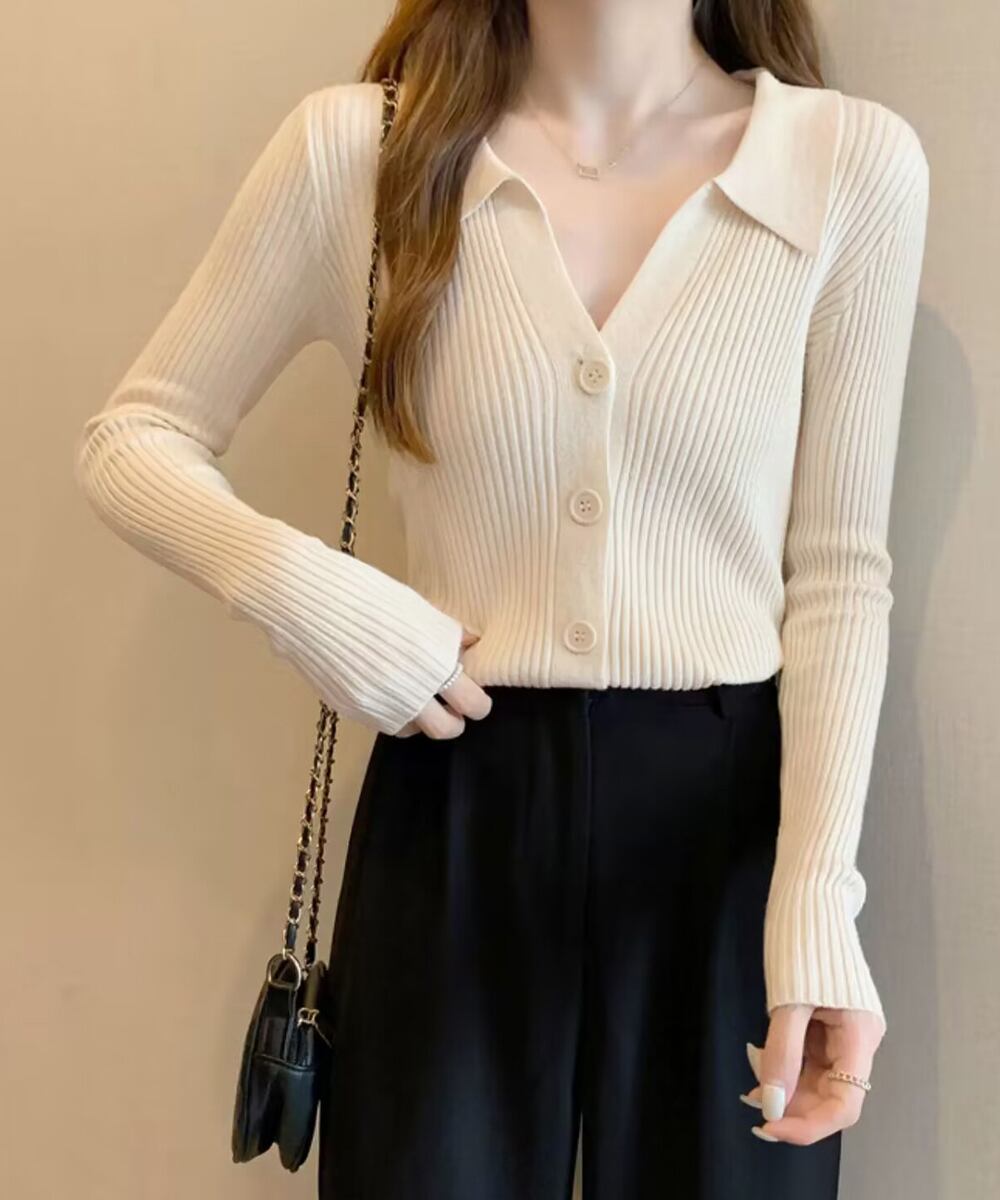 Vネックと襟付きのデザインが小顔に見せるニットトップス