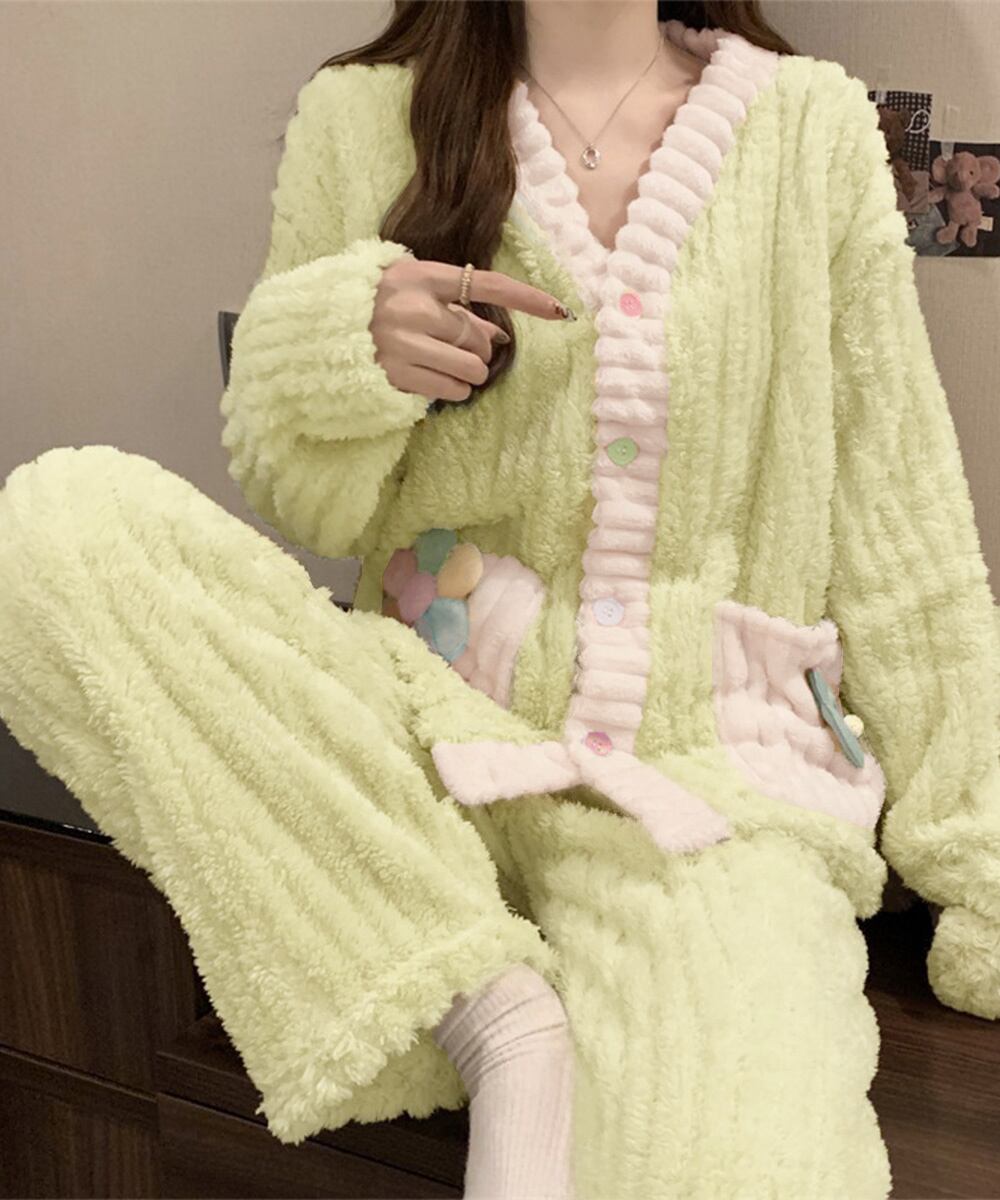 レディース もこもこパジャマ上下セット 大人可愛い寝巻き 暖かい長袖ナイトウェア 冷え防止 ボアパジャマ あったか部屋着