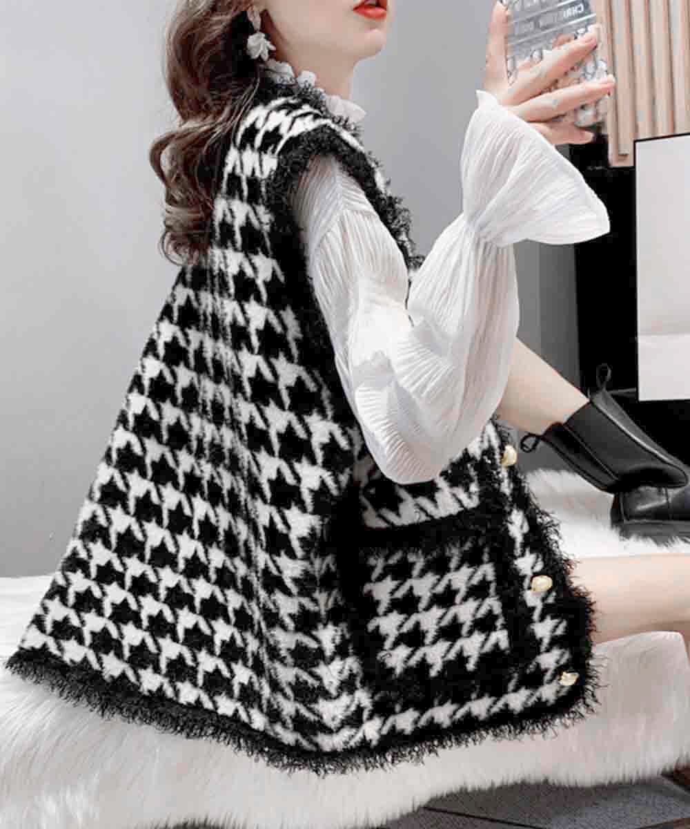 モノトーンの千鳥格子柄が、大人っぽさと上品さを演出し、幅広いスタイルに合わせやすいファッションベスト