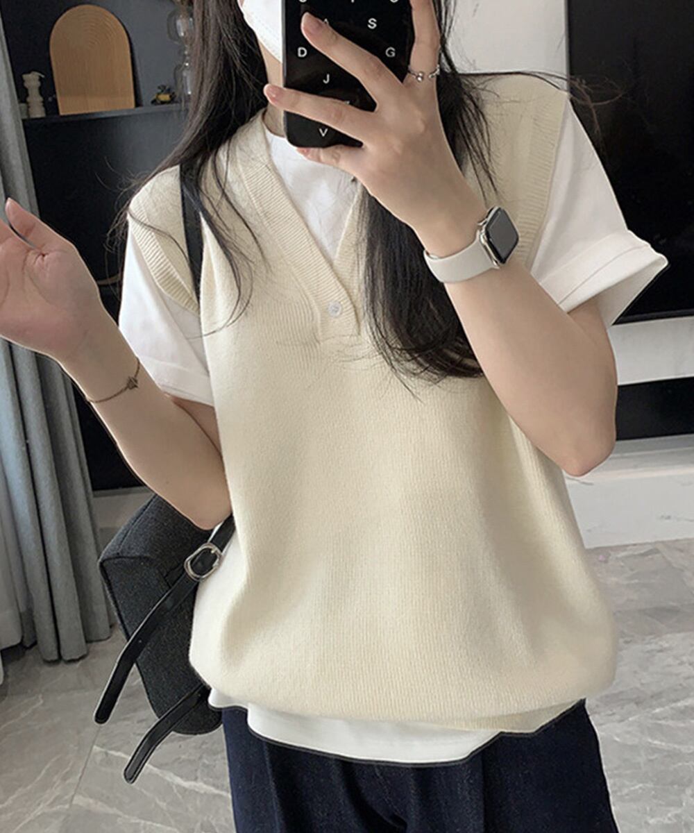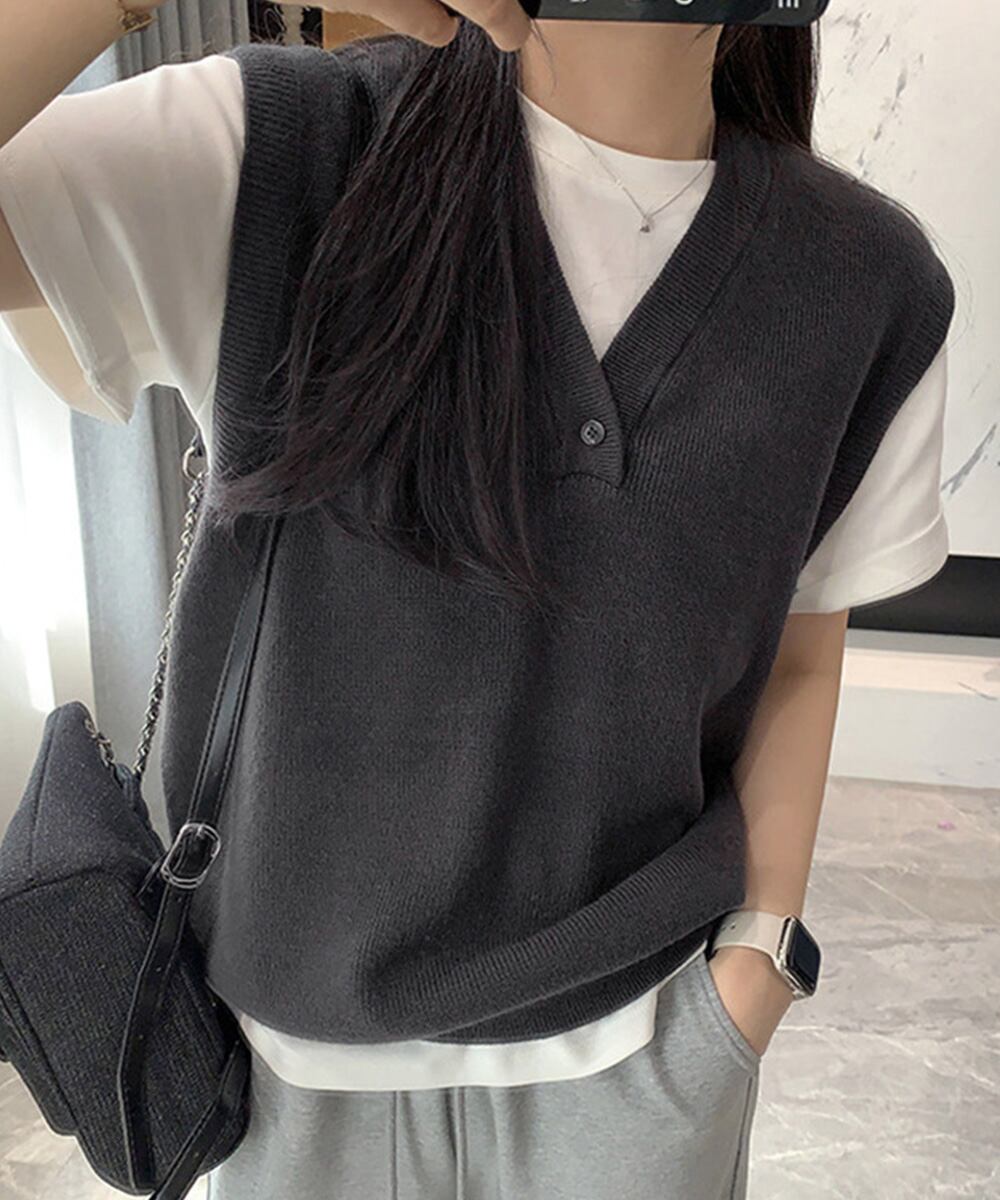 無地ニットチョッキ 着やせニット 通学 カジュアル ベスト