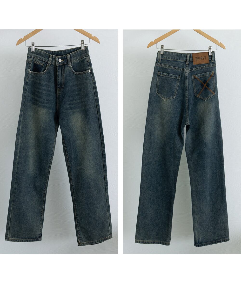 レトロ風ジーンズ ハイウエスト ウォッシュデニム 美脚脚長 セミワイドパンツ フルレングス 着やせジーパン 体型カバー