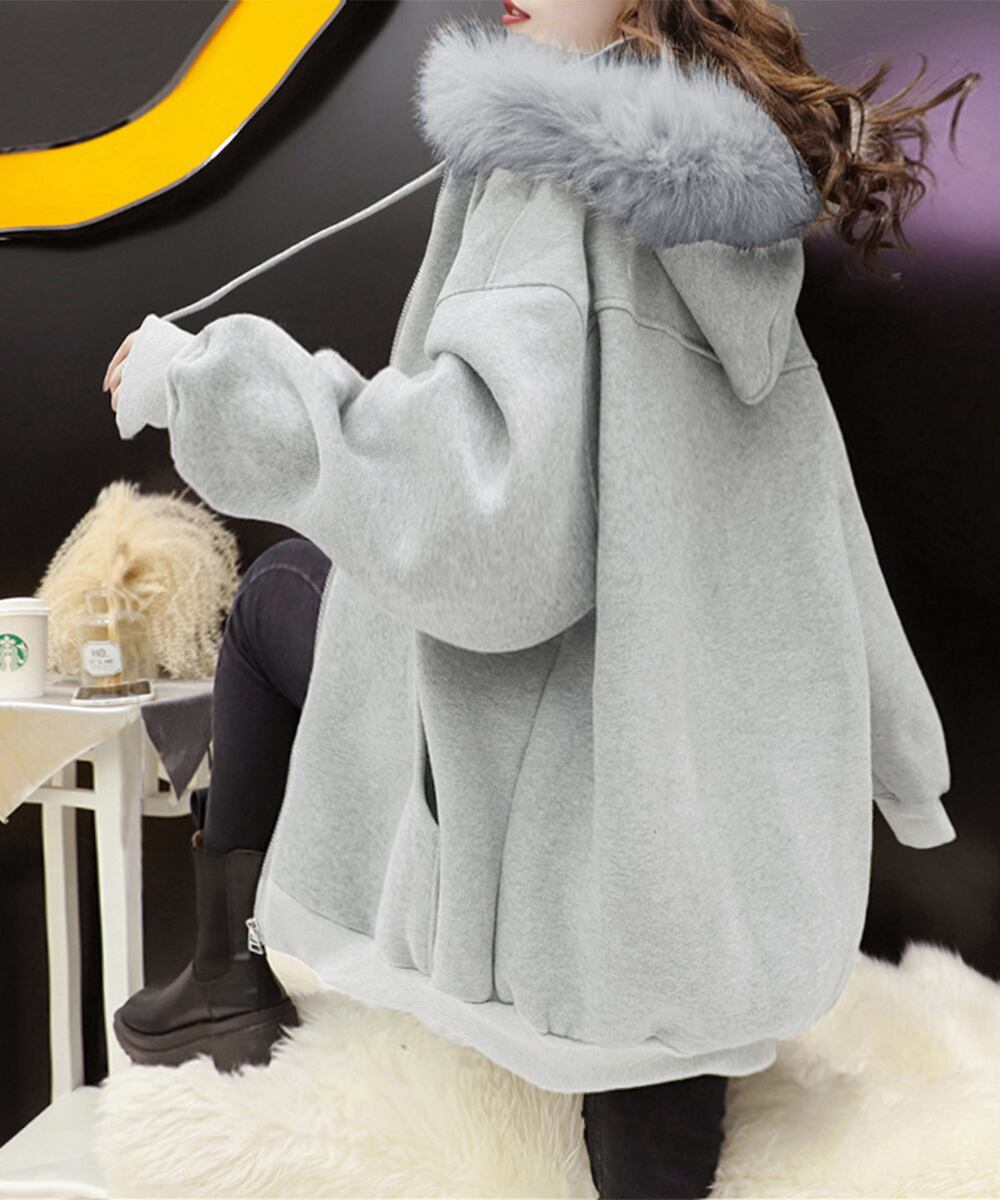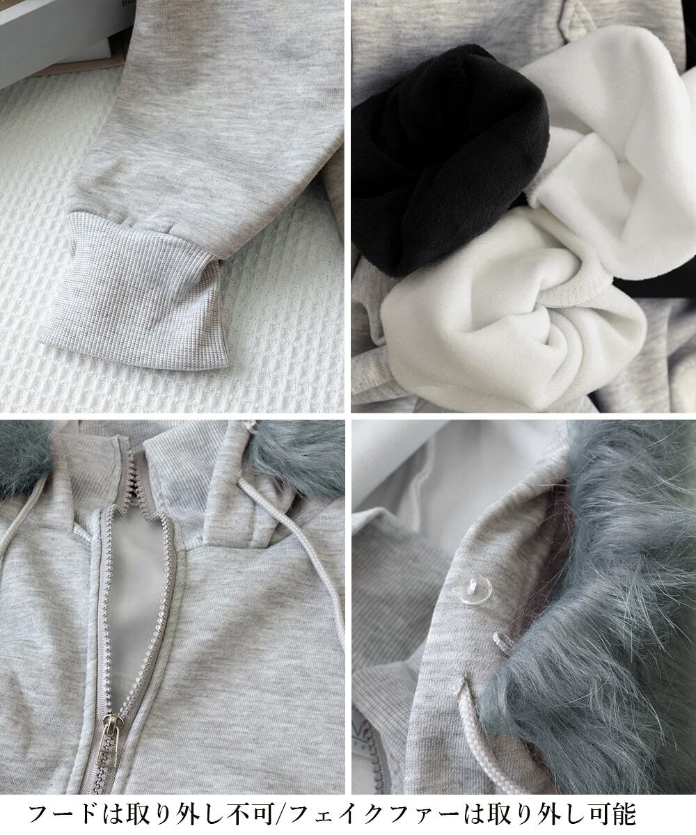 ふわふわのファーフード付きで、大人カジュアルにぴったりの裏微起毛ジップアップパーカー