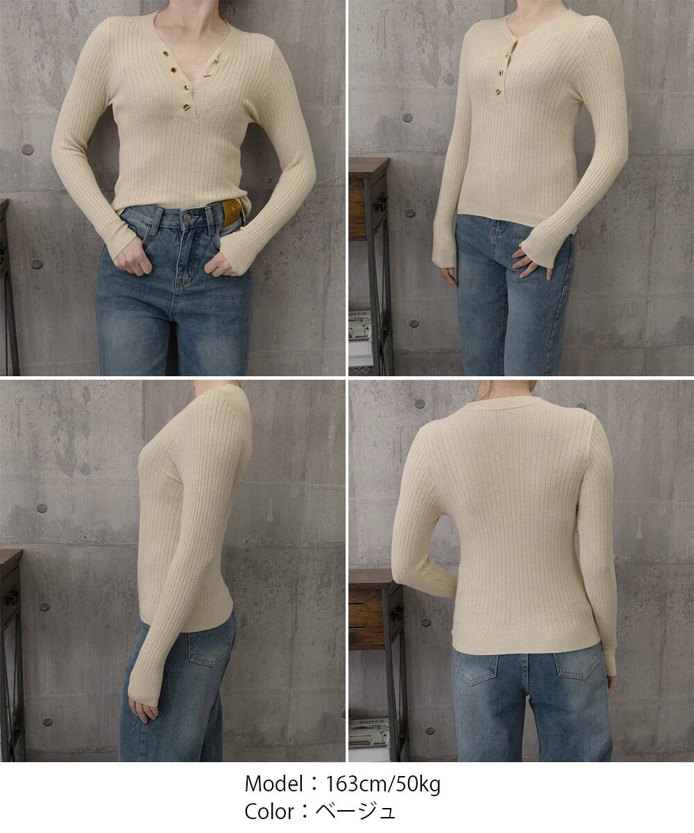 【日本倉庫即納】 Vネックリブニットトップス ハーフボタン