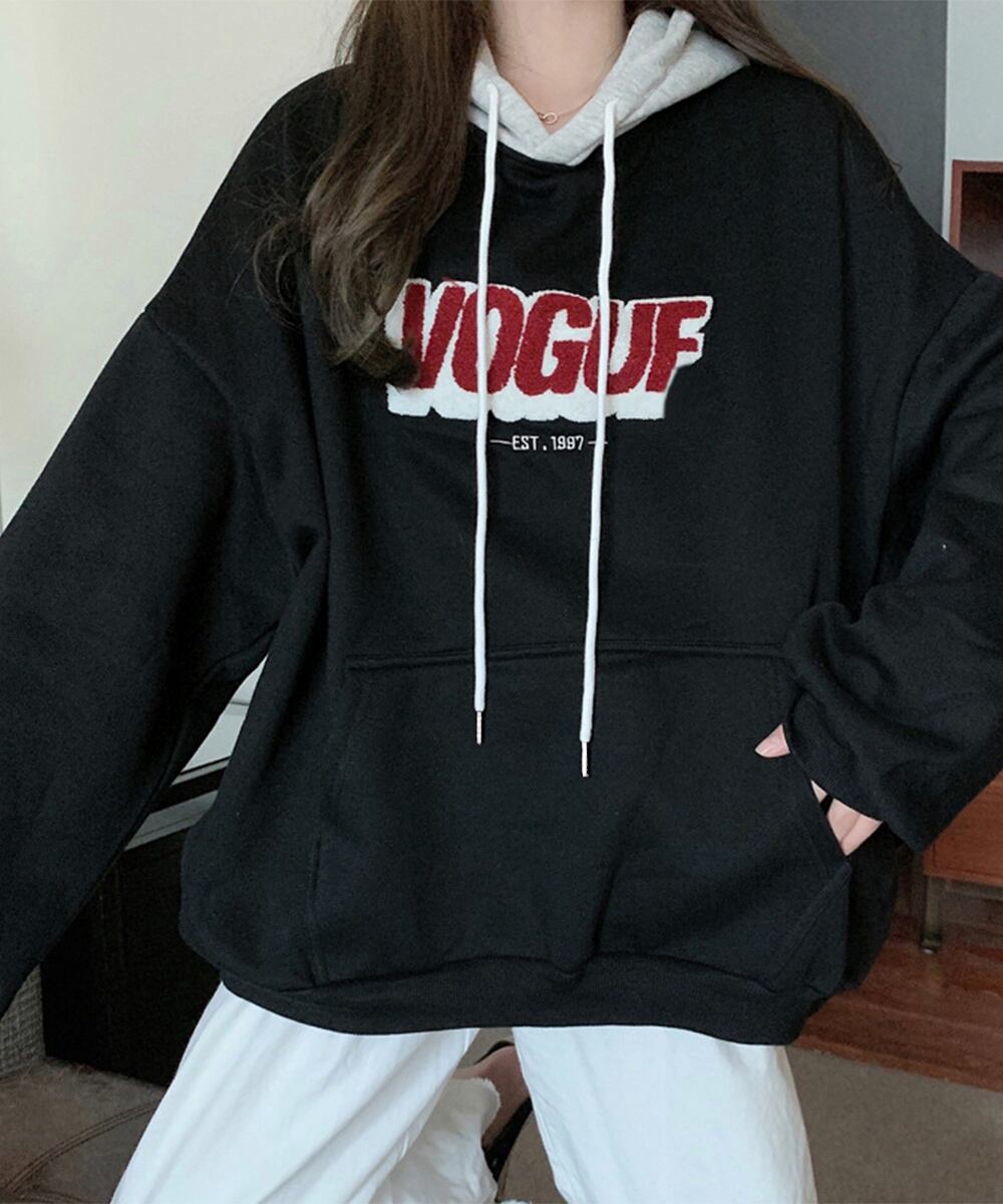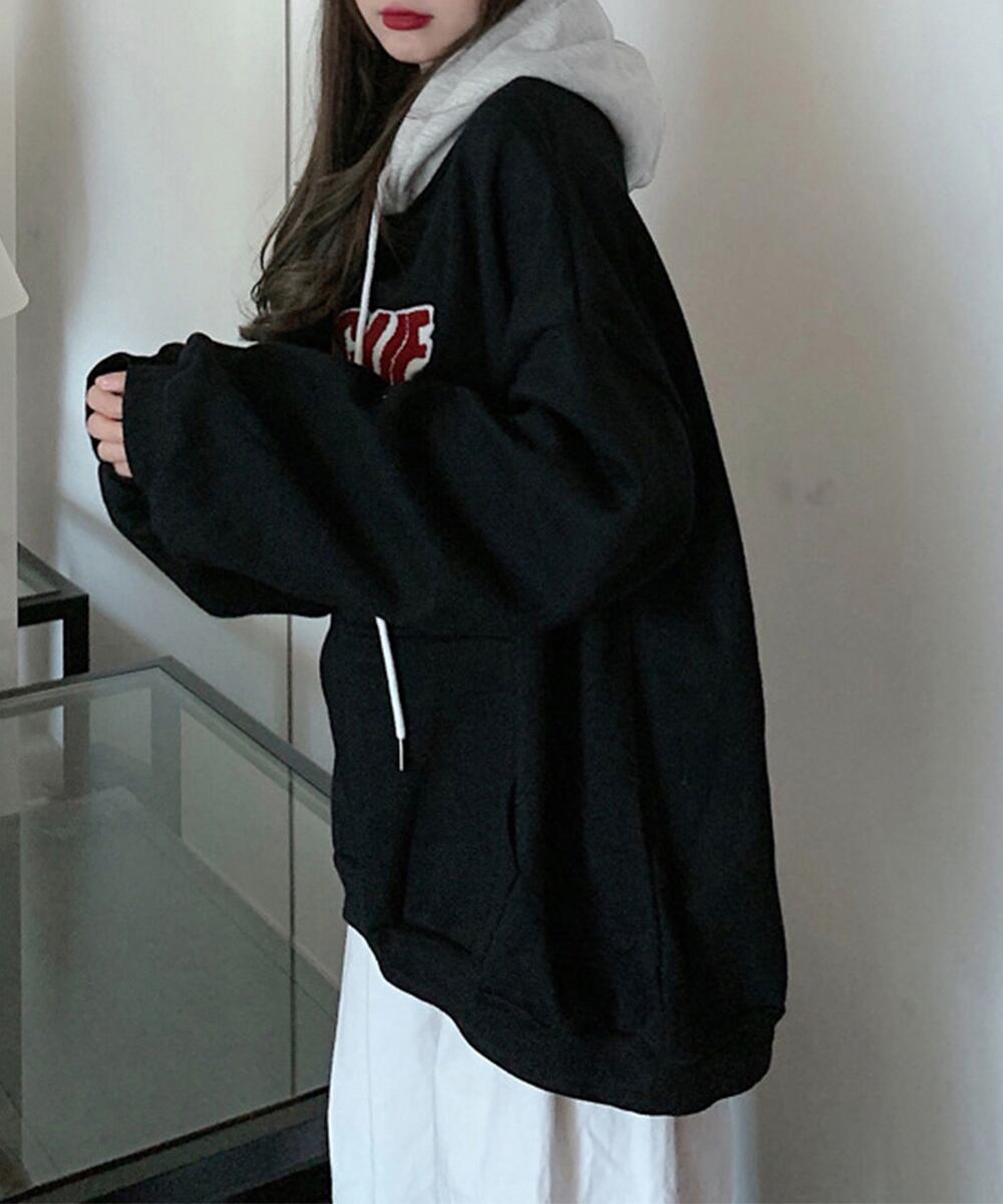 フード付きスウェット ビッグシルエット プルパーカー 韓国風トップス 英字ロゴロングトレーナー 体型カバー 暖かい秋冬服