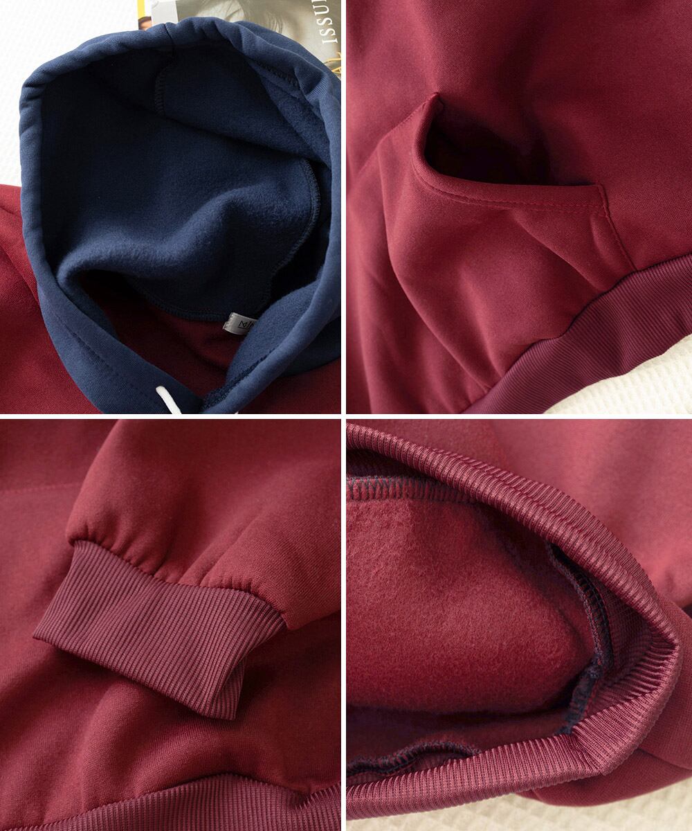 やさしい肌触りの裏起毛素材で、着心地抜群のフード付きBF風パーカー。