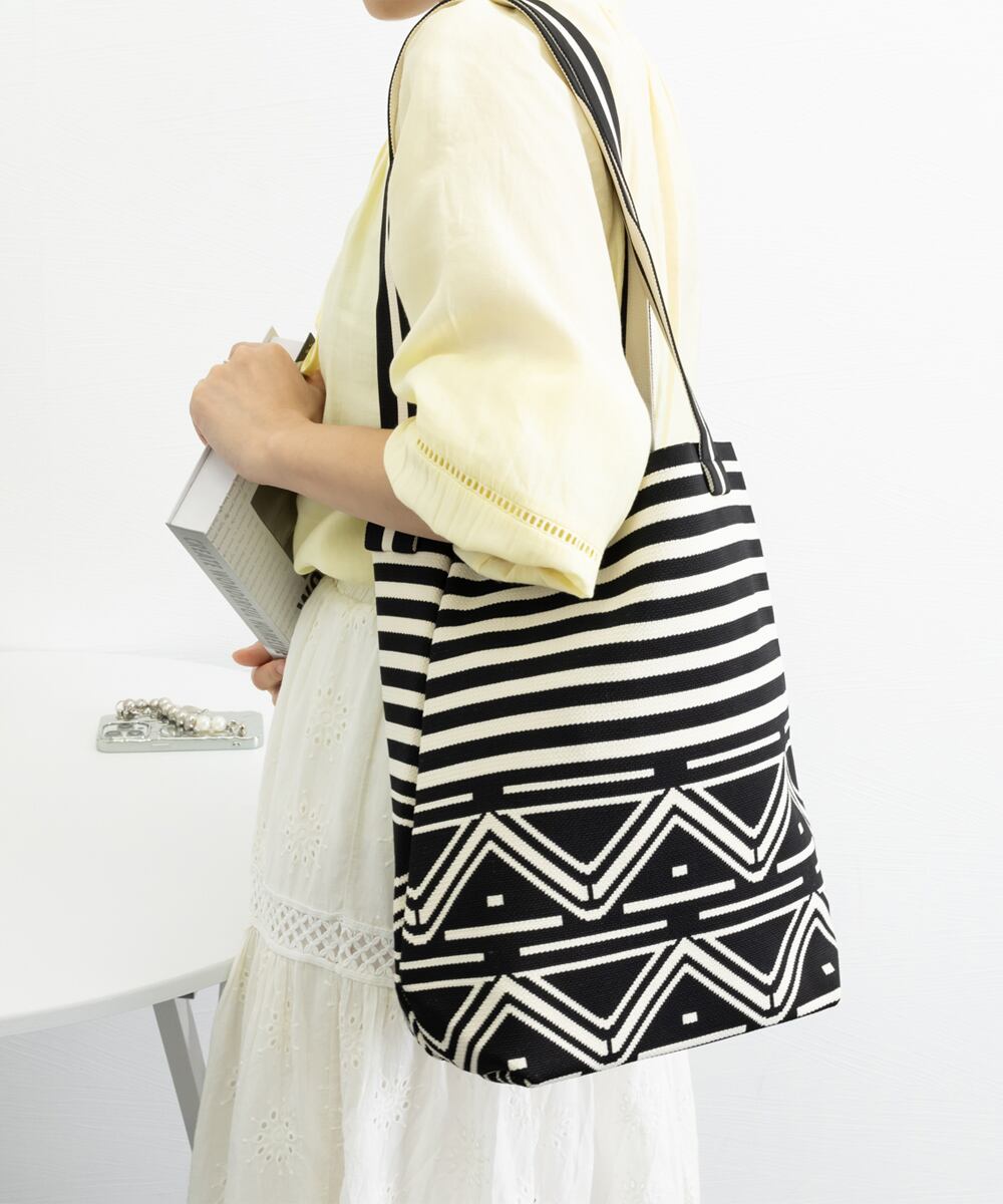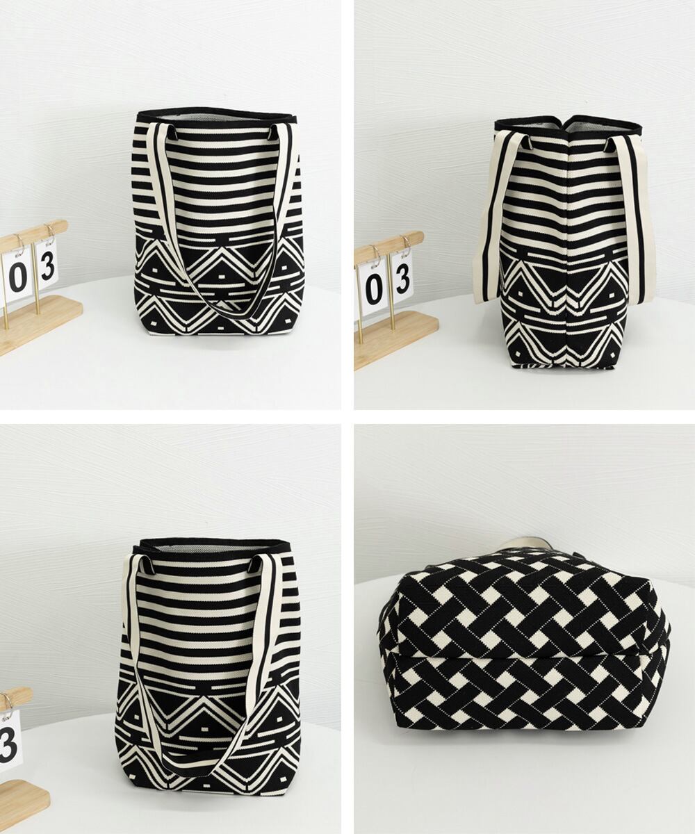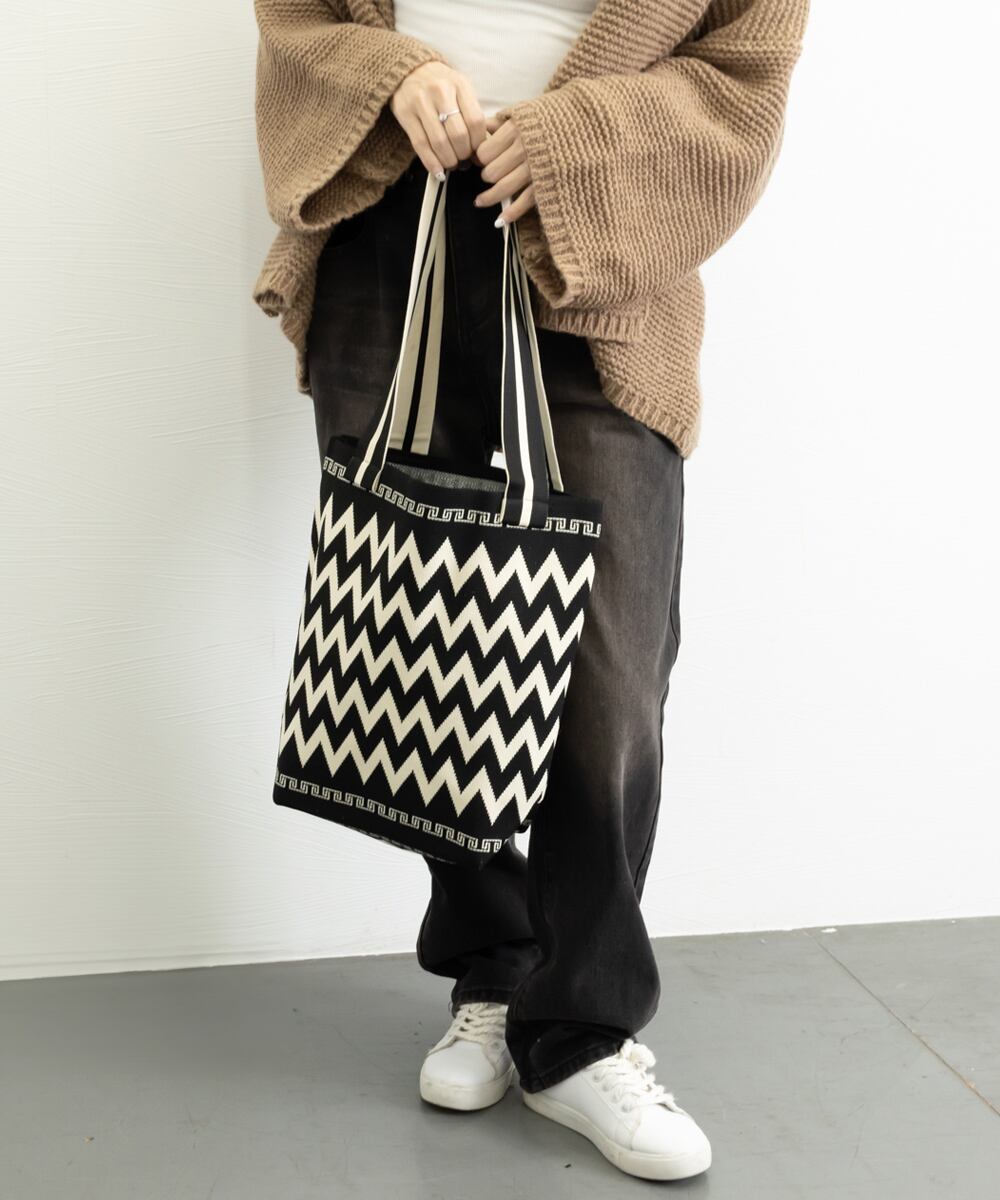 スタイリングに映えるデザインが目を引くニット素材のマルシェトートバッグ