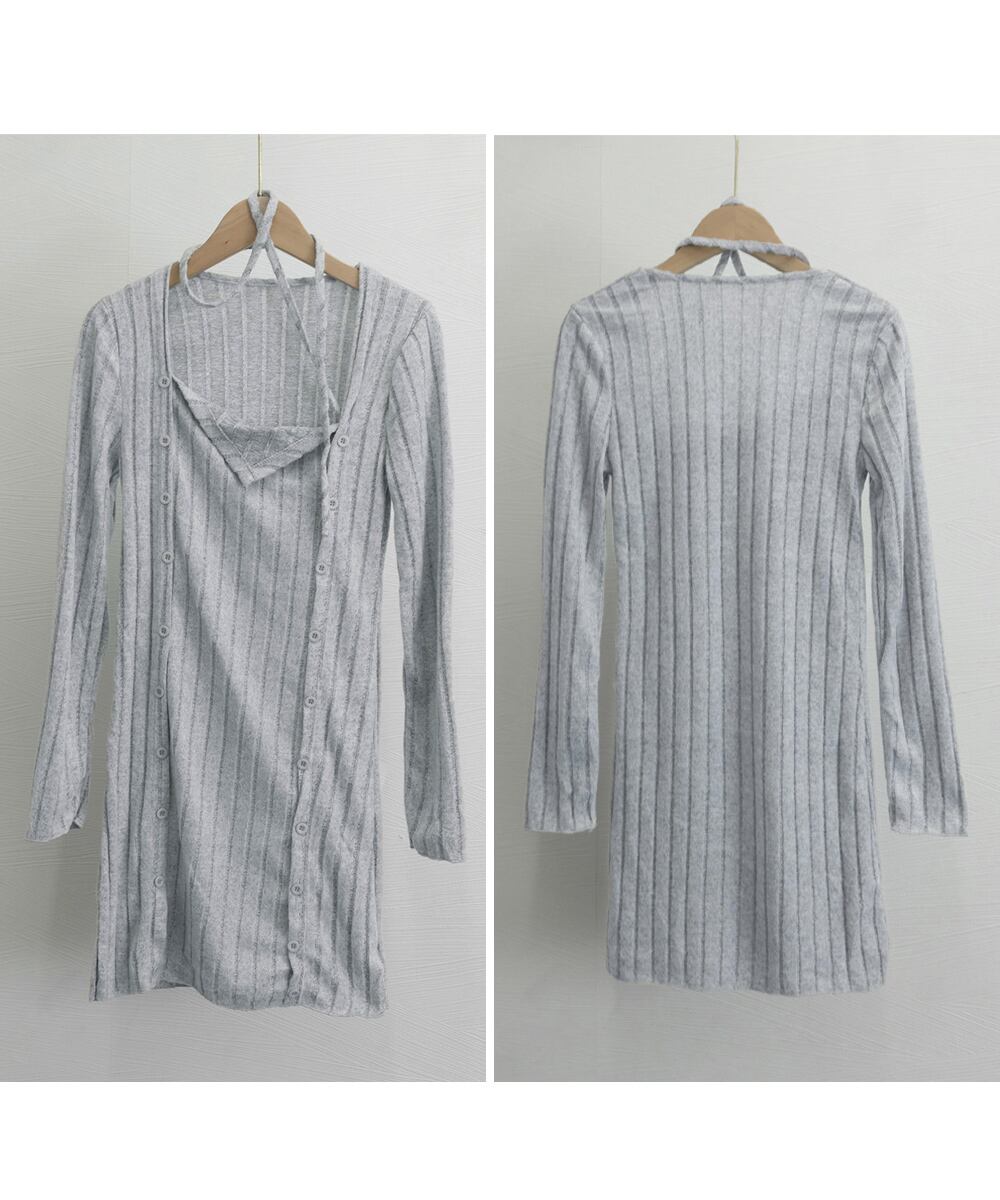 伸縮性のあるニット素材で、程よく体にフィットし、ボディラインを美しく魅せるホルターネックワンピース。