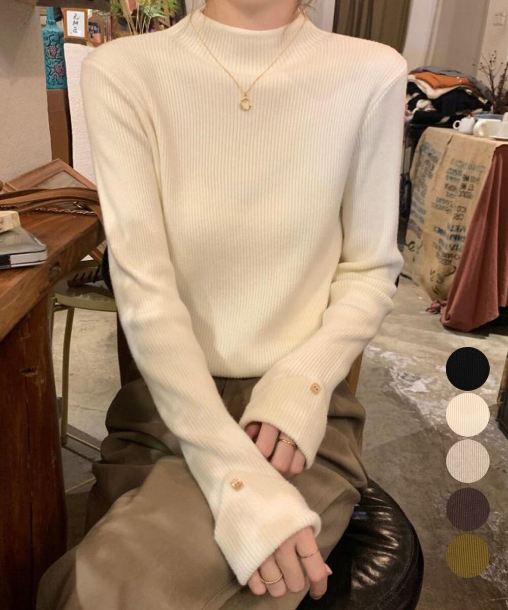 【日本倉庫即納】 プチハイネックニットトップス 袖口ボタン