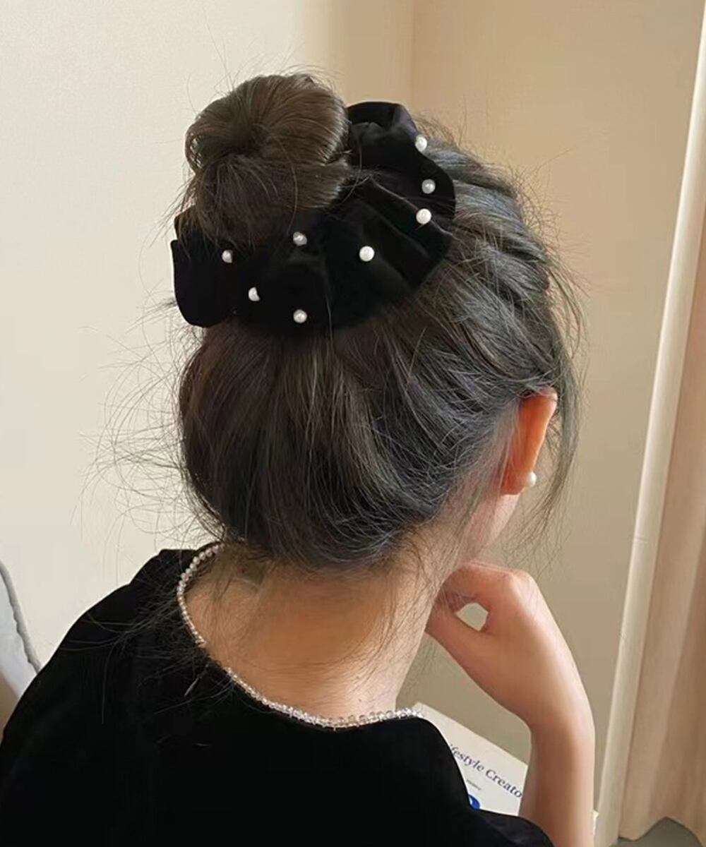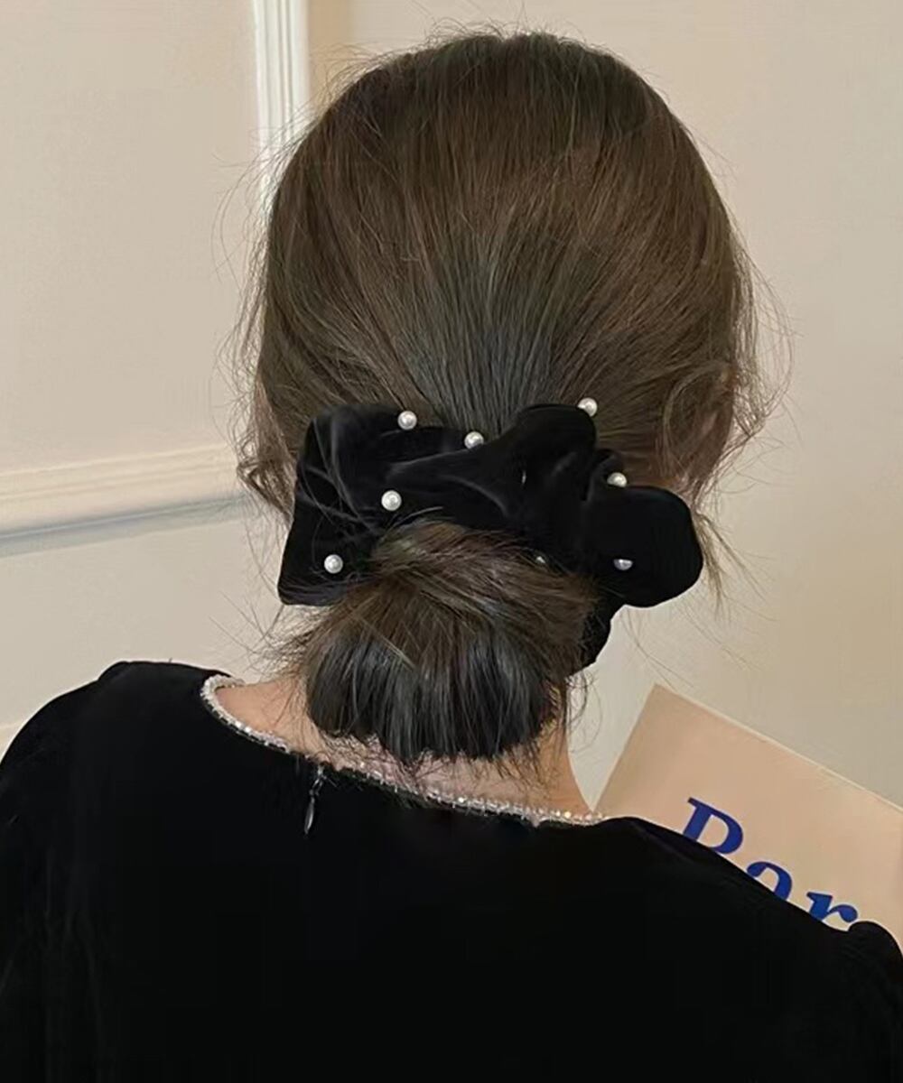 ベルベット生地にフェイクパールが飾った大人上品なシュシュ