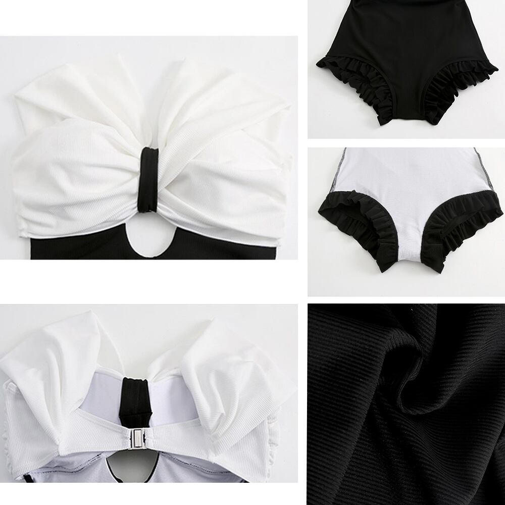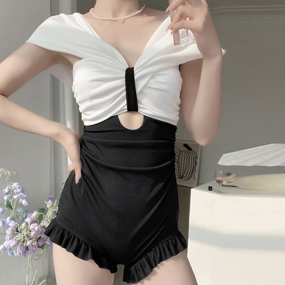 韓国風スイムウェア バイカラー バックオープン オールインワン水着 裾フリル オトナ女子 モノキニ 海水浴 プール 夏海