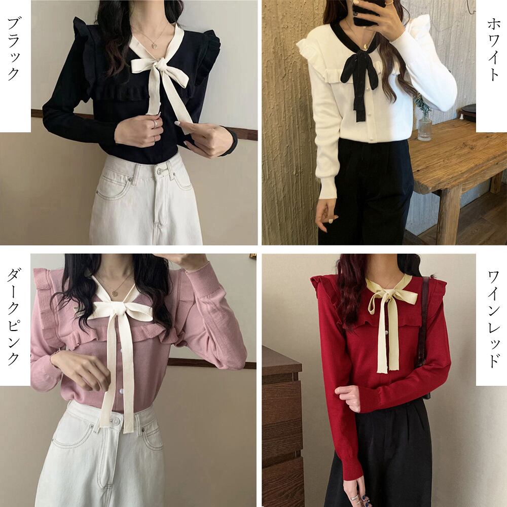 リボン ニットセーター Vネックニットインナー カジュアル ニットソー プルオーバー 長袖 かわいい