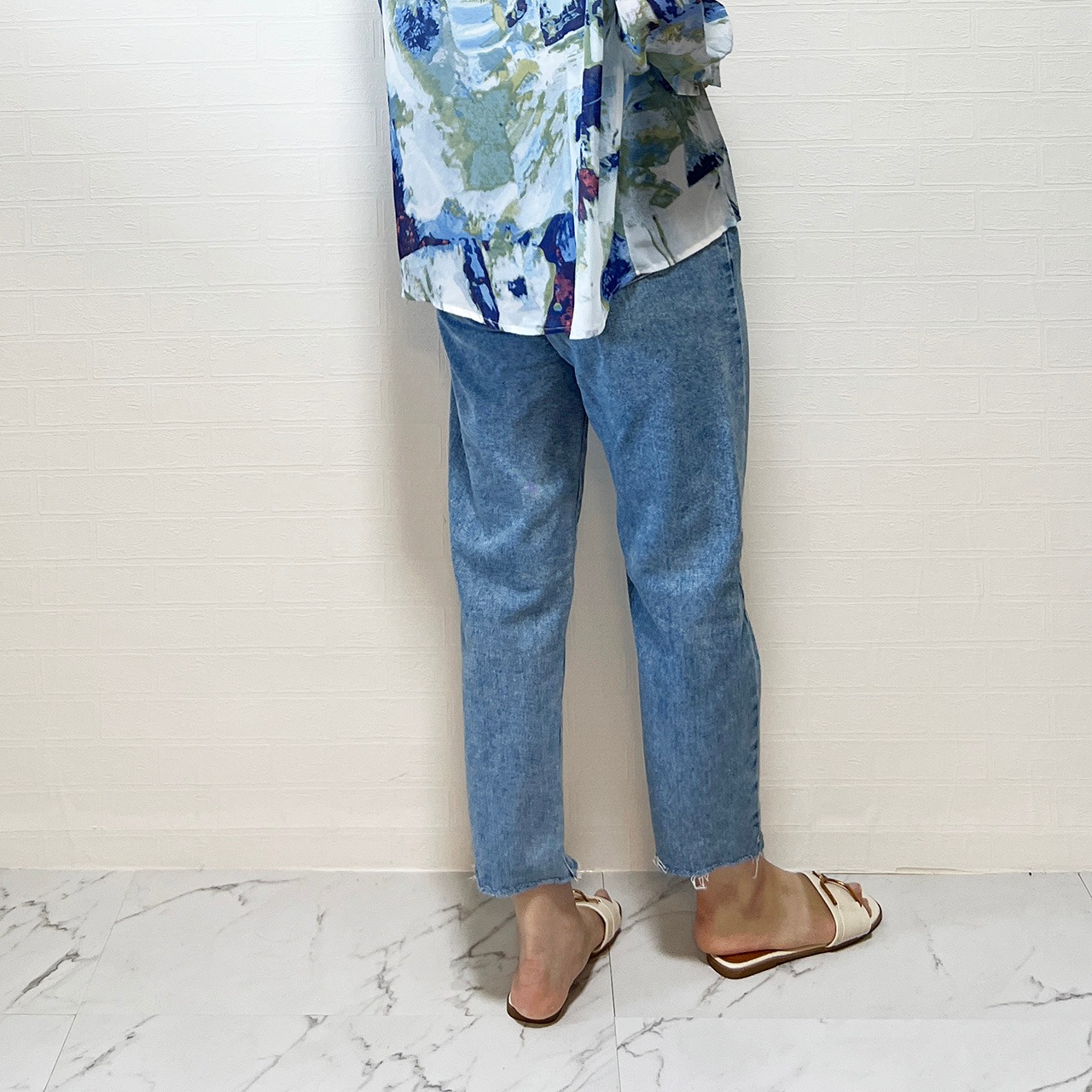 美しい足元を演出するサックスデニムパンツが登場しました。ハイウエスト設計と深めの股上で、腰回りを包み込むようにフィットします。さらに、ストレッチ性に富んだデニム生地で、着心地も抜群です。