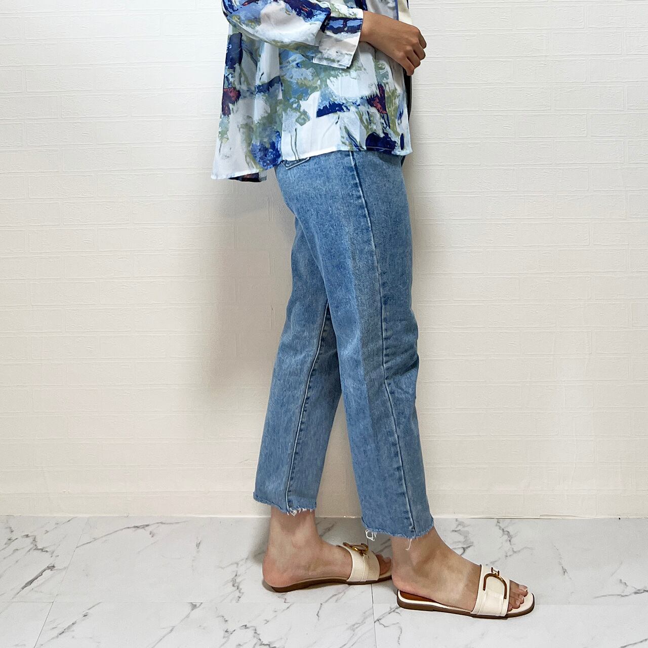 このデニムパンツは裾をカットオフ加工し、フレアのシルエットを持っています。このデザインにより、足のラインを美しく強調し、スタイリッシュな印象を与えます。動きやすさも考慮されたボトムスで、オールシーズン着用できます。