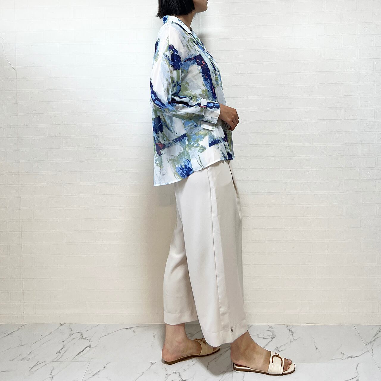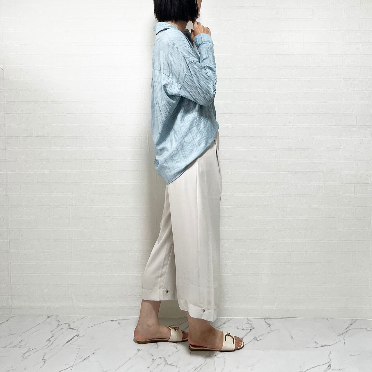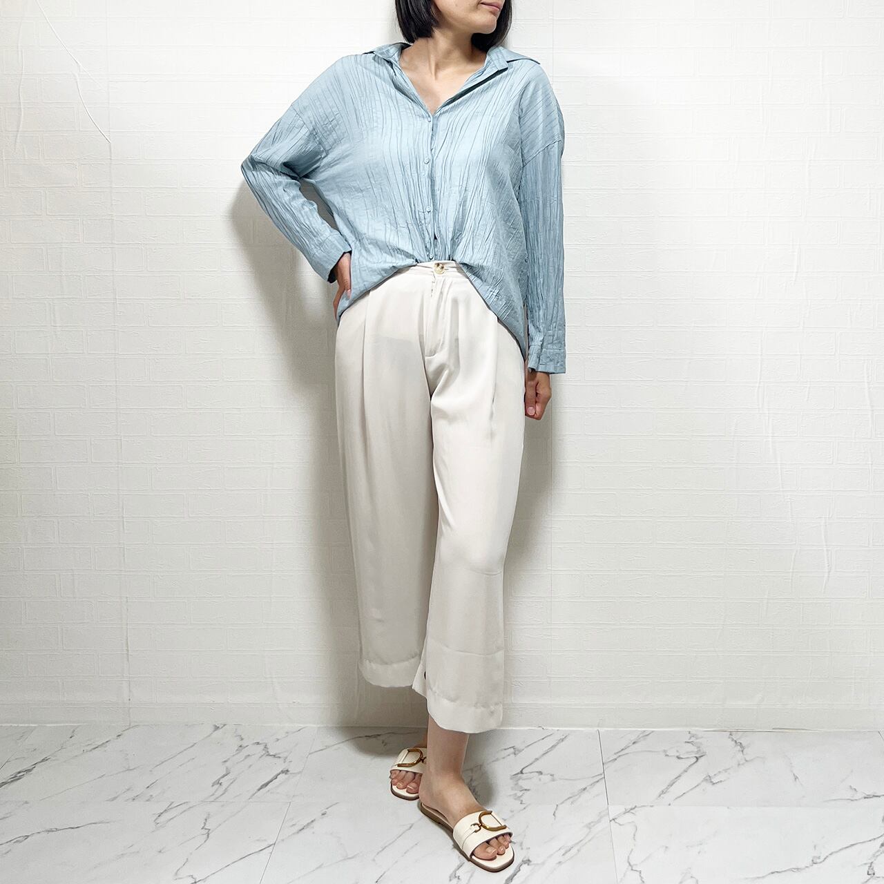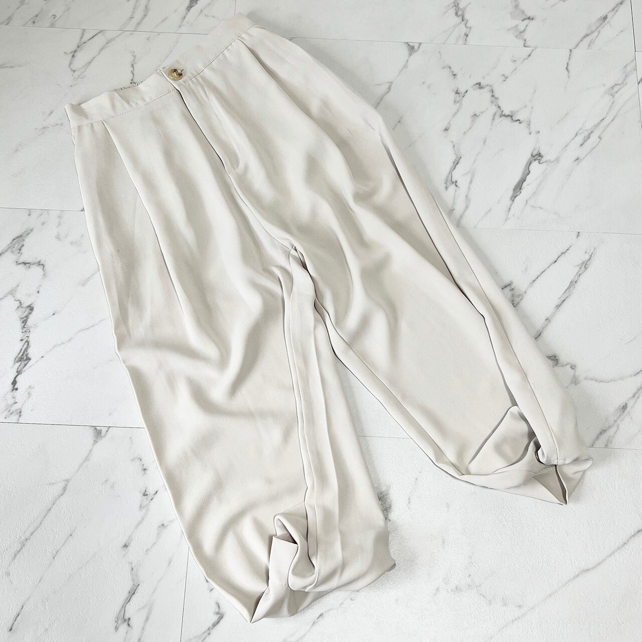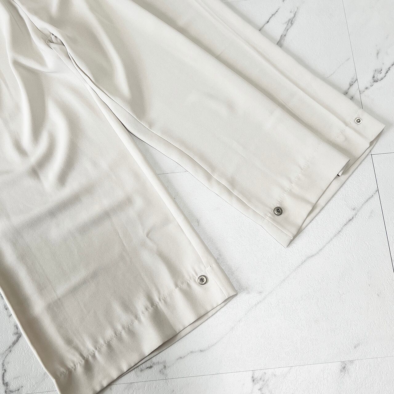 これらの要望にお応えする、ユニークなパンツがこちら。1本でワイドパンツとして着用できる他、裾の部分を止めればジョガーパンツとしても着こなせる変形パンツです。その肌触りはもちろん、光沢感がありサラサラとした素材で、夏にぴったりのアイテムです。ウエストの後ろ部分にゴムが使われているため、楽に着こなすことができます。