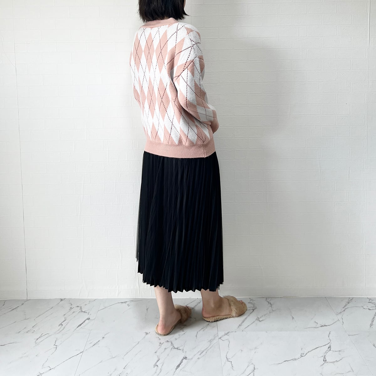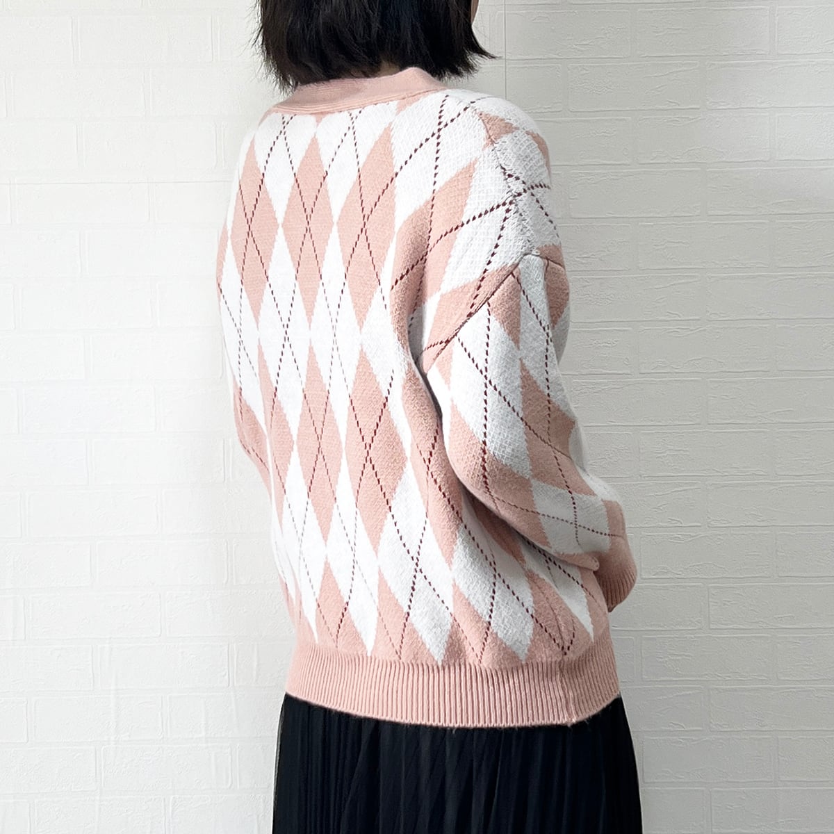 このカーディガンは、ゆったりめのシルエットで、優しい配色のアーガイル柄がカジュアルでガーリーな雰囲気を醸し出しています。Vネックデザインが女性らしさを引き立てます。