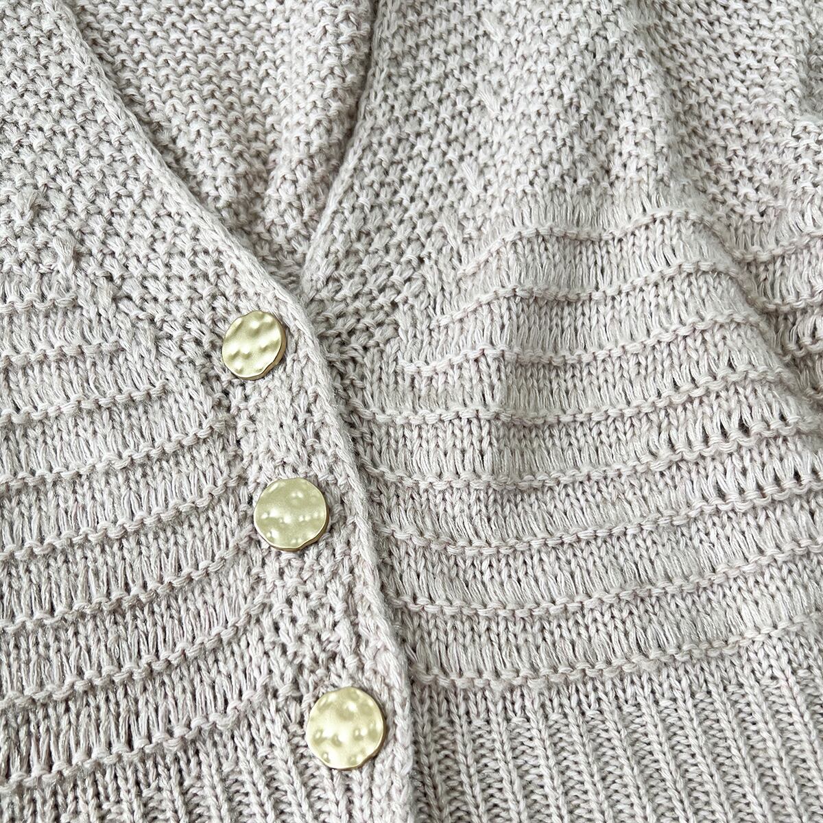 このカーディガンは、一枚で着たり羽織ったりと、シーズンの変わり目に大活躍します。特に注目すべきは、ゴールドのボタンがアクセントとして効果的に使われており、よりおしゃれな印象を演出しています。
