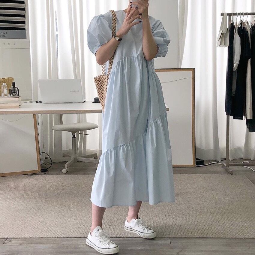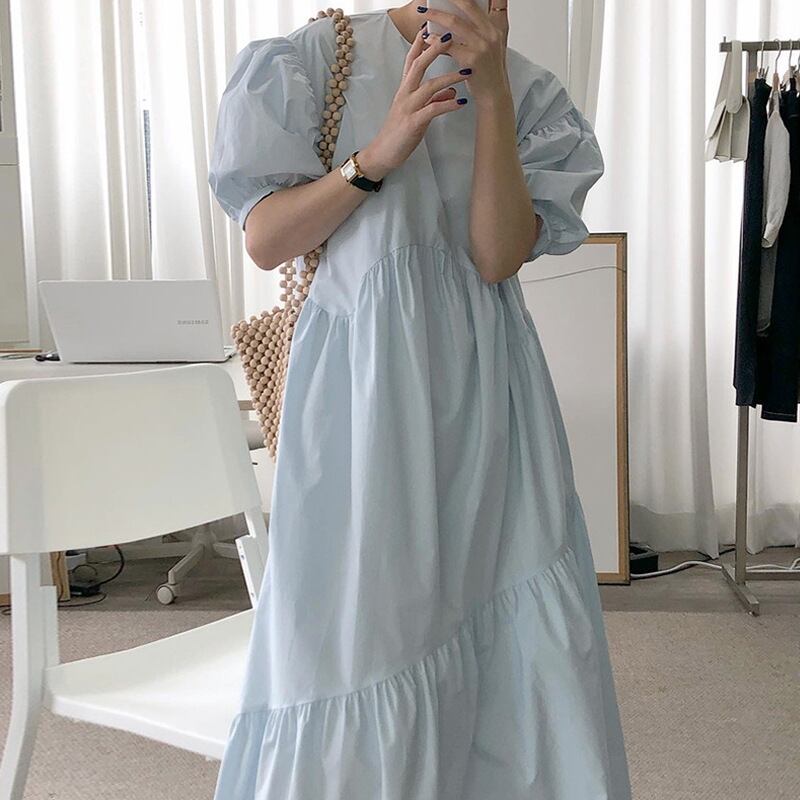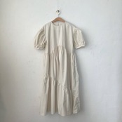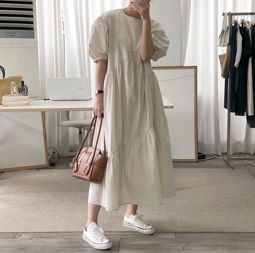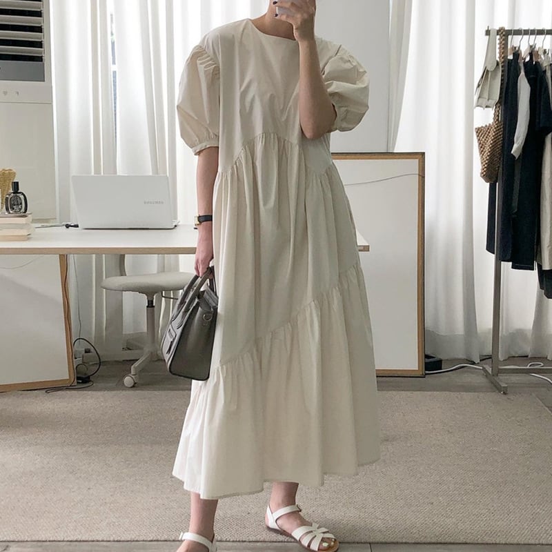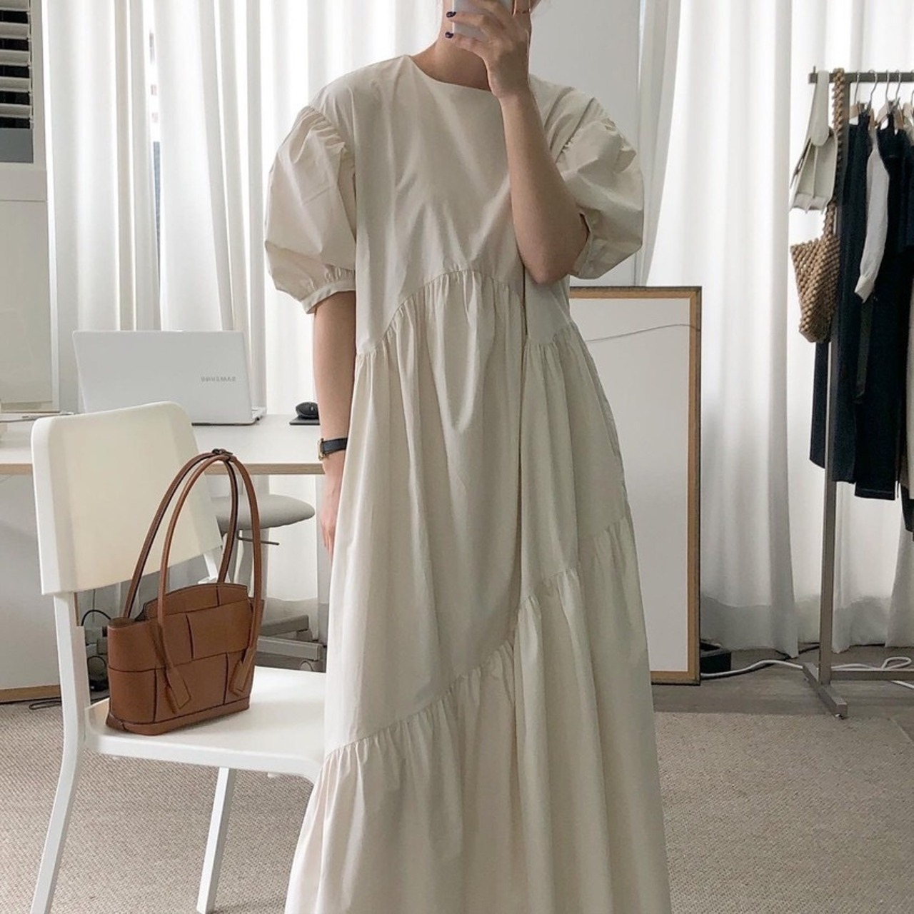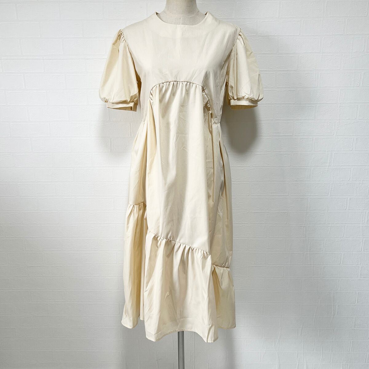 このシャツワンピースは、ふんわりとしたシルエットながらも、フロント部分に施されたギャザーデザインがスタイルを引き締めてくれます。袖のボリュームがトレンド感を演出し、おしゃれなデザインとなっています。